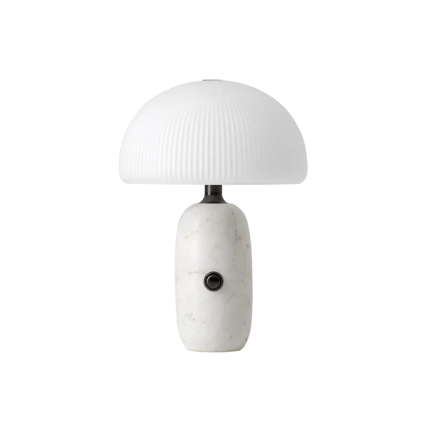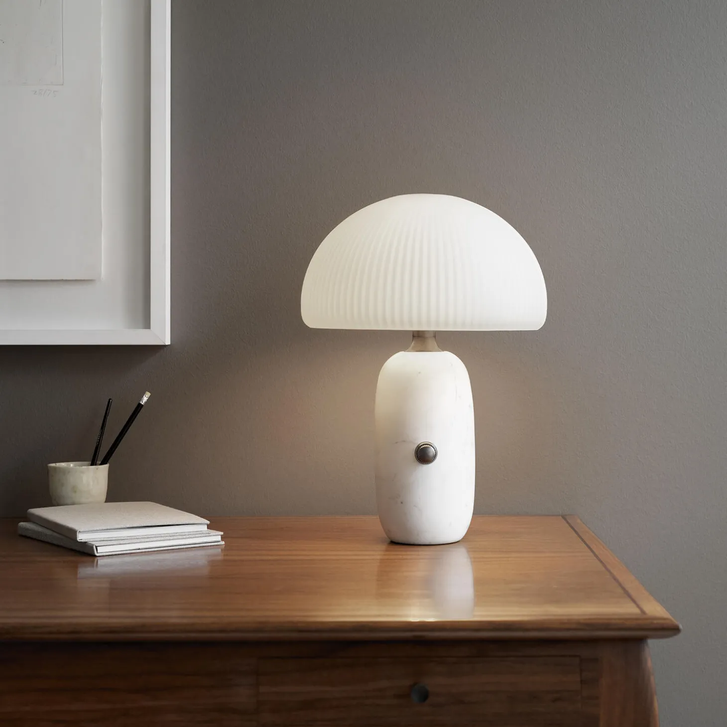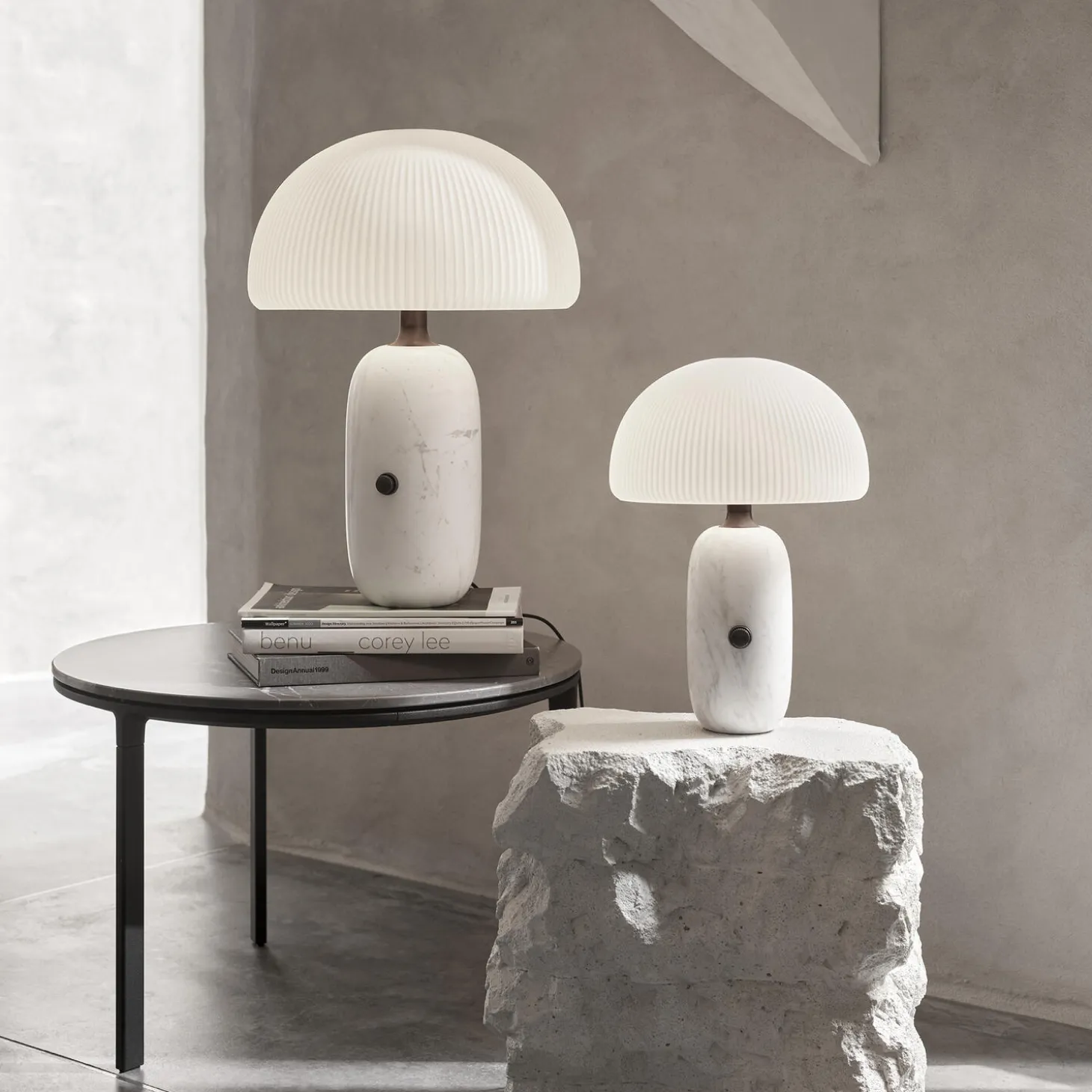 Den lille Vipp Sculpture bordlampe er ideel som dekorativ belysning og er velegnet til stuen eller soveværelset. En holdbar LED-enhed er skjult under en trelags opal glasskærm, der giver en hyggelig belysning. Den runde cylinderbund, der fås i enten grå eller hvid marmor, har en lysdæmper og en stofdækket ledning.