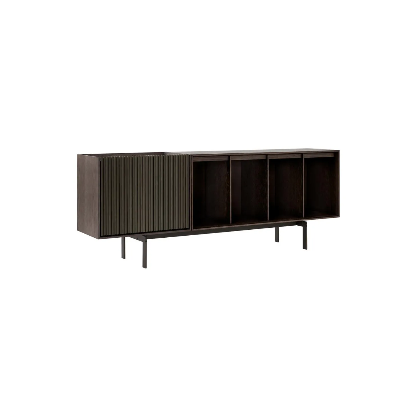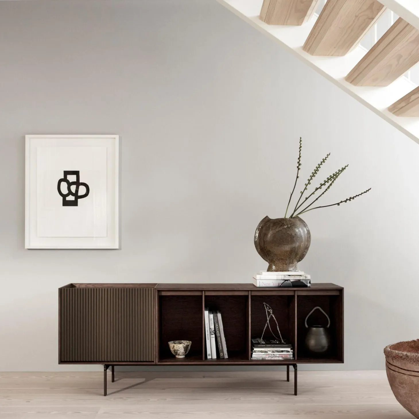 Med Vipp675 Chimney-kabinettet kan du opbevare dine ejendele på en smuk måde. I kabinettets fire åbne rum, der oplyses af et blødt, indbygget lys, kan du sætte de ting, du ønsker at vise frem – og bag en rillet dør af aluminium kan du opbevare alt det andet. I tillæg til dette tilføjer en nedsænket marmorplade en bakkelignende funktion til møblet.