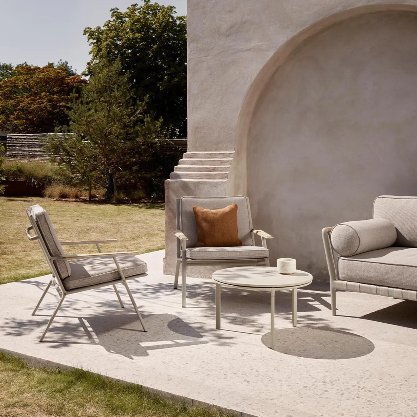 - Materiale: pulverlakeret aluminium med udendørsbelægning, stål, polstring i vandafvisende og UV-resistent tekstil og polyrattan rygstøtte