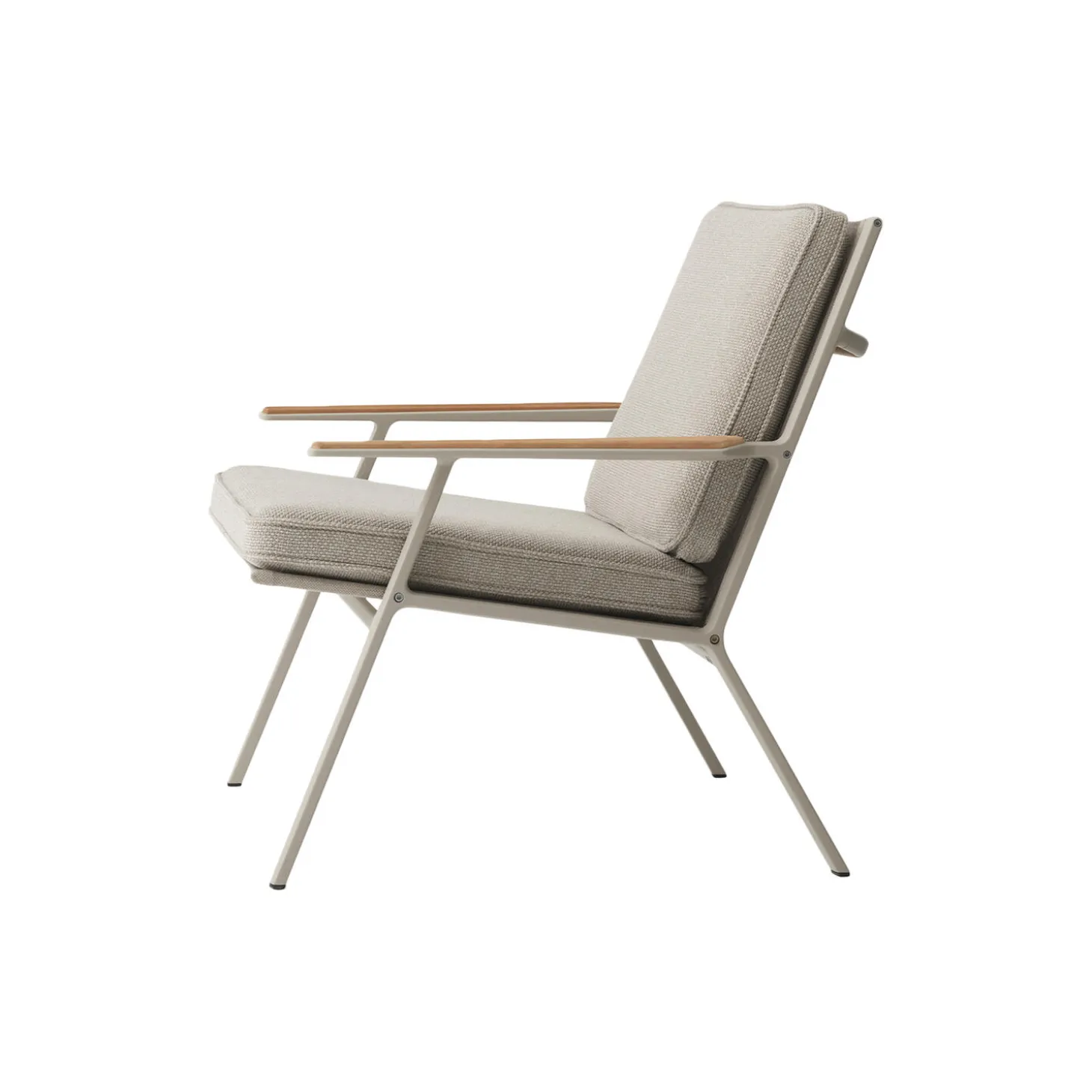 The Vipp713 Open-Air lounge chair is modelled after the indoors Vipp456 lounge chair. Consisting of the similarly shaped aluminum frame, two separate, removable, and washable cushions make up the backrest and the seat. The armrests have rounded teak details covering the surface.