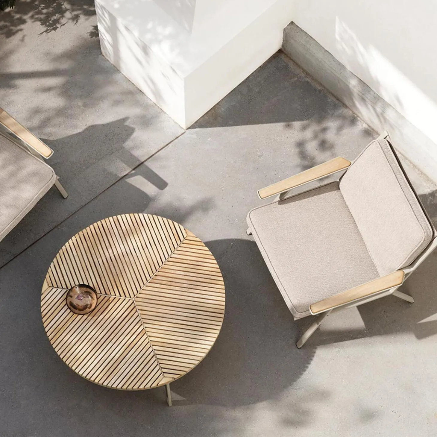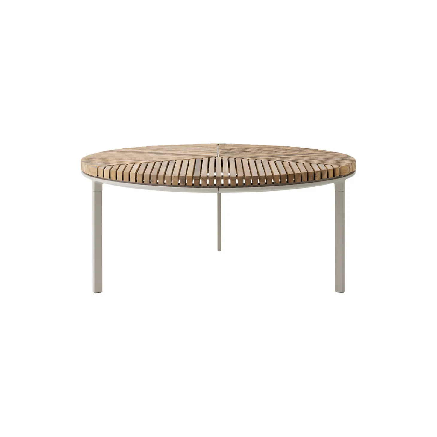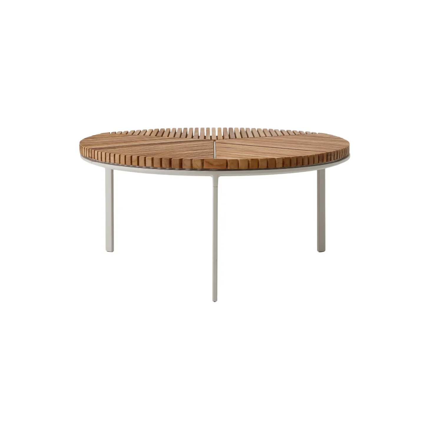 The Vipp716 Open-Air coffee table is modelled after the indoors Vipp425 Coffee table. Consisting of a three-legged aluminum frame with a Ø90 tabletop consisting of teak lamellas, the coffee table offers a durable and elegant look for the lounge area. It can be combined with the Vipp714 Ø60 coffee table.