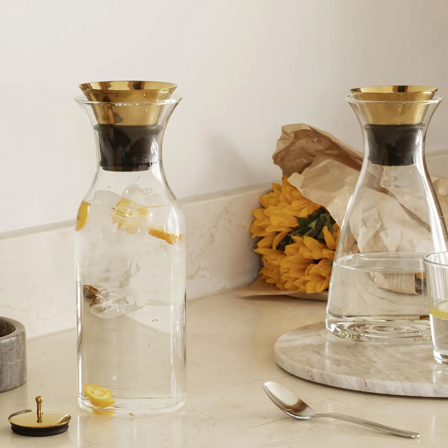 Vippelåg i pudsefri PVD-belægning i messinglook. Låget passer til Eva Solo drypfri karaffel så karaflen kan anvendes som praktisk køleskabskaraffel.