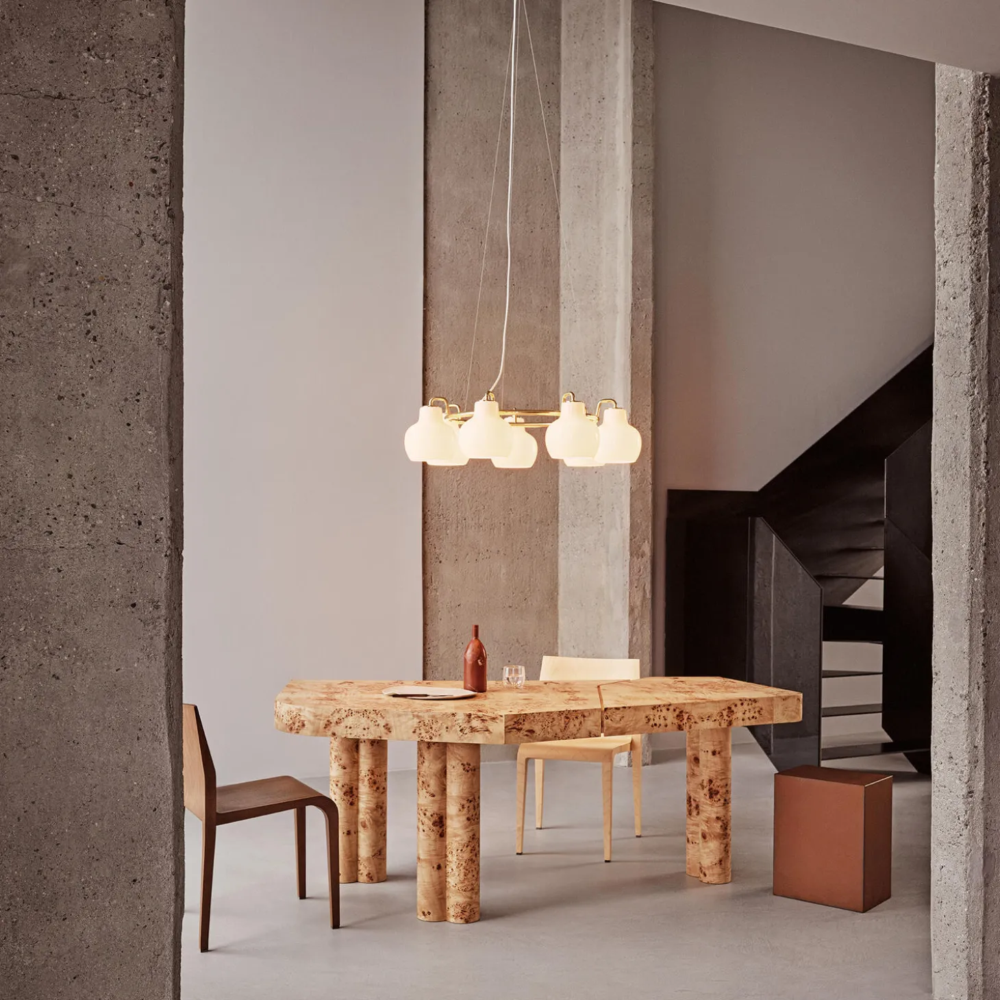VL Ringkrone 7 i mundblæst trelags opalglas og ubehandlet børstet messing fra Louis Poulsen. Farve: opal. Mål: H: 23,3 x Ø 89,3 cm. Lyskilde: maks. 60W E27. Design: Vilhelm Lauritzen.
