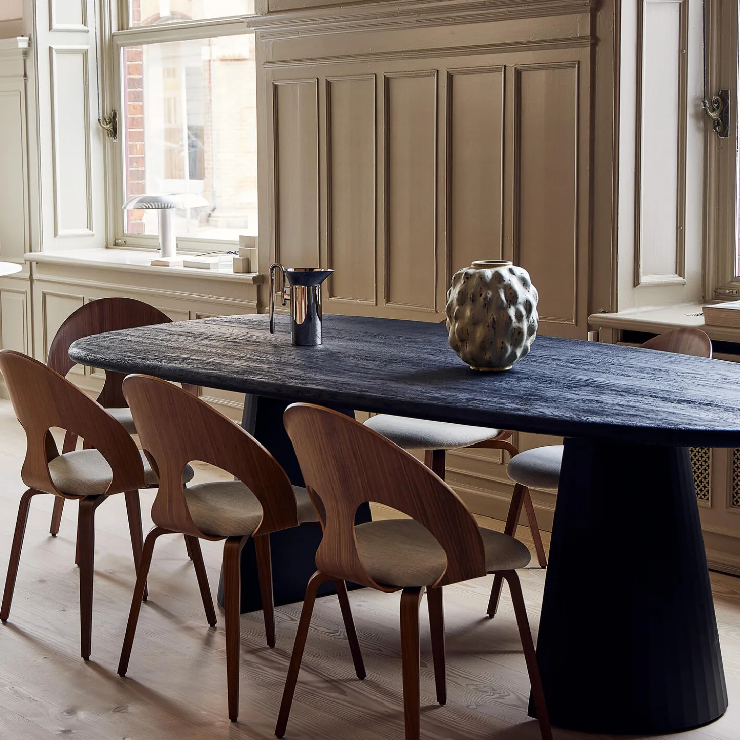 VL1100, også kaldet ”Øjestolen” er en udtryksfuld spisebordsstol designet af Vermund Larsen i 1956. VL1100 er en imponerende spisebordsstol, der øjeblikkeligt fanger opmærksomheden med sit unikke, organisk formede ryglæn med kurver og udskæringer. Stolen udtrykker elegance i materialesammensætningen, der er en kombination af FSC-certificeret træ, konisk formede ben i enten træ eller stål samt sædepolstring i stof eller læder – alt er monteret i hånden på vores faciliteter i Aalborg