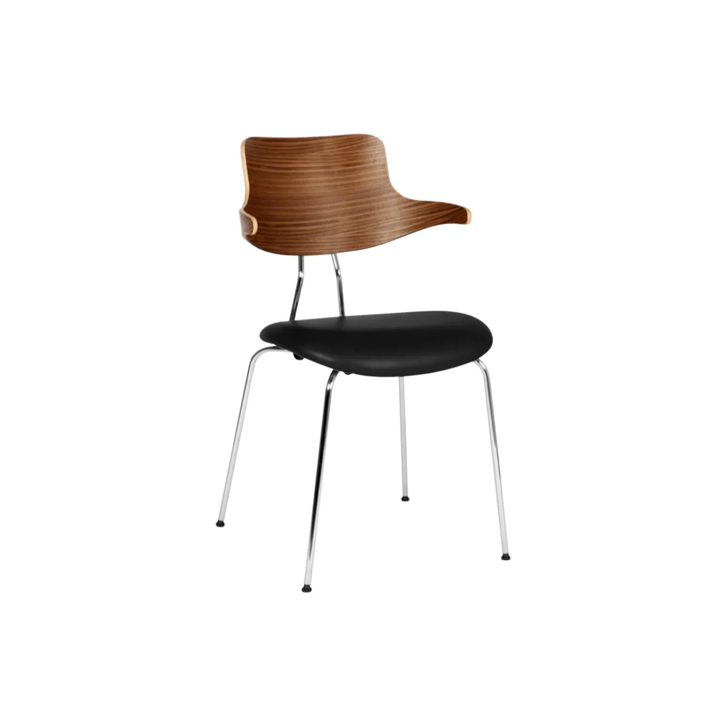 - Materiale: ryg af valnød, sædepolstring i Savanne 30307 sort læder af Sørensen Leather og stel i krom højstyrkestål