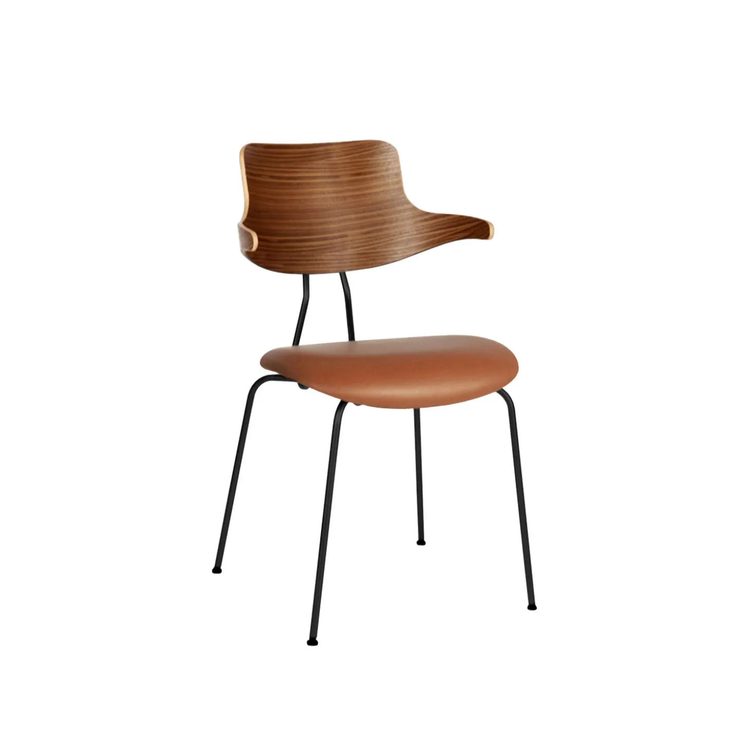 - Materiale: ryg af valnød, sædepolstring i Ultra 41574 brandy læder af Sørensen Leather og stel i sort højstyrkestål