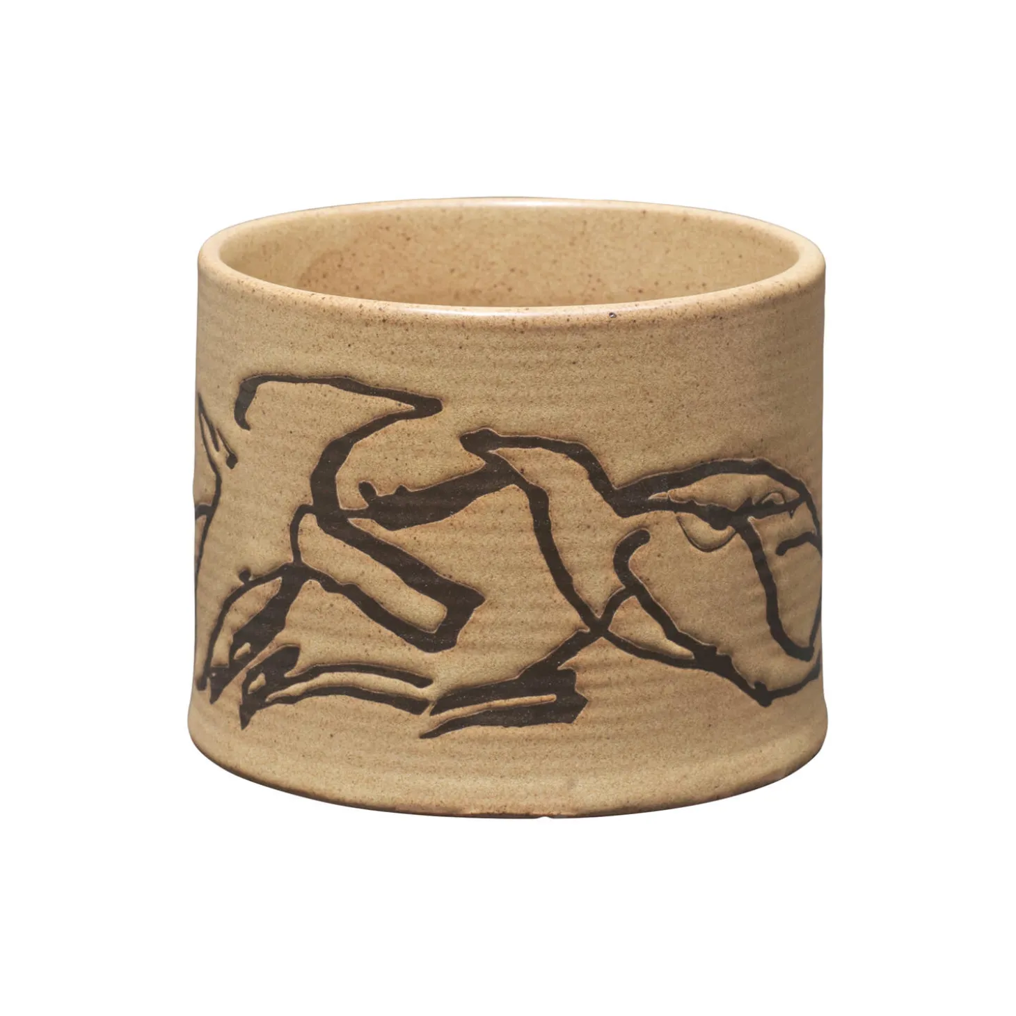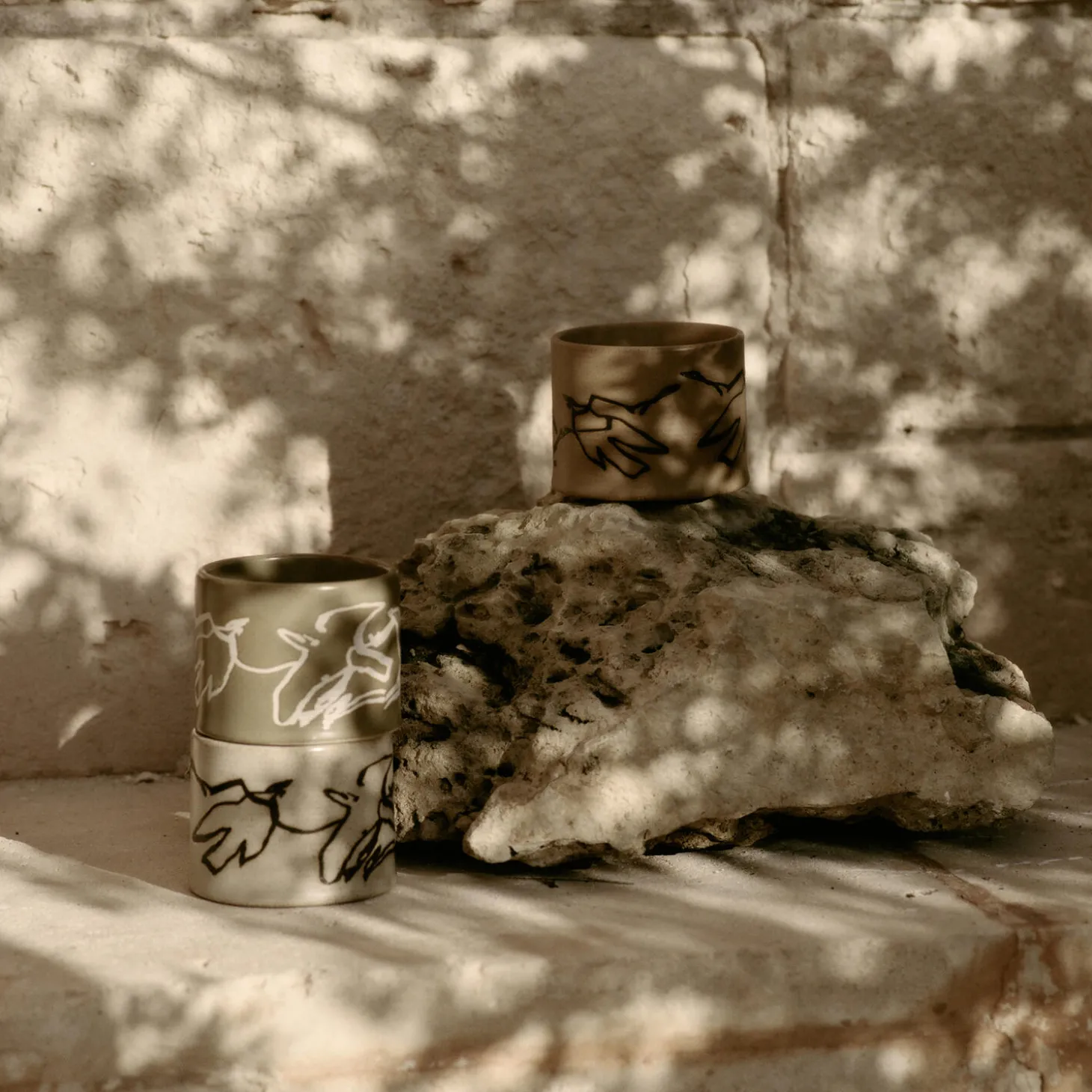ferm LIVING x Utzon – Can Lis-samarbejdet er inspireret af arkitekten Jørn Utzons privatbolig på Mallorca, hvor de naturlige omgivelser smelter sammen med designelementer, der afspejler hans unikke filosofi. Vuelo Kop gengiver de elegante fugleskitser, som Utzon skabte i sin tid på Can Lis. Koppen er opkaldt efter det spanske ord for ’flyvning’ og indfanger fuglens flydende og yndefulde motiv. Hver enkelt genstand er fremstillet af glaseret keramik og har tydelige hånddrejede mærker, som giver det en unik håndværksmæssig kvalitet. Fuglemotivet er udført med en traditionel batikteknik, hvor voks modstår glaseringen, hvilket resulterer i komplekse mønstre, der forstærker koppens håndværksmæssige karakter.
