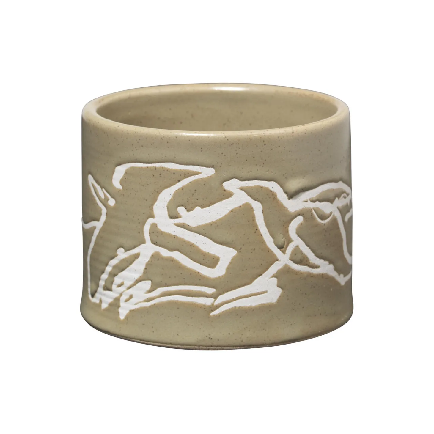 ferm LIVING x Utzon – Can Lis-samarbejdet er inspireret af arkitekten Jørn Utzons privatbolig på Mallorca, hvor de naturlige omgivelser smelter sammen med designelementer, der afspejler hans unikke filosofi. Vuelo Kop gengiver de elegante fugleskitser, som Utzon skabte i sin tid på Can Lis. Koppen er opkaldt efter det spanske ord for ’flyvning’ og indfanger fuglens flydende og yndefulde motiv. Hver enkelt genstand er fremstillet af glaseret keramik og har tydelige hånddrejede mærker, som giver det en unik håndværksmæssig kvalitet. Fuglemotivet er udført med en traditionel batikteknik, hvor voks modstår glaseringen, hvilket resulterer i komplekse mønstre, der forstærker koppens håndværksmæssige karakter.