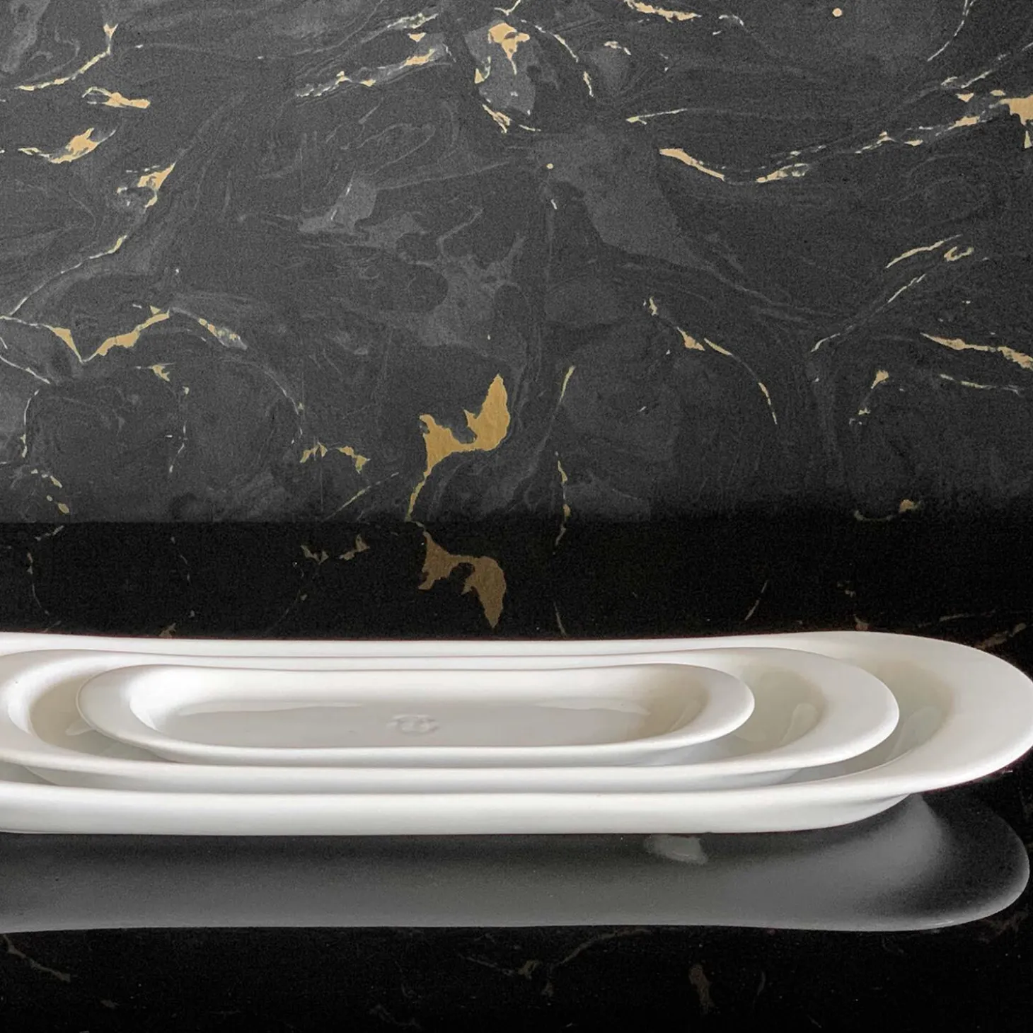 Kay Bojesen fremstillede i 1950erne sit ikoniske fiskefad i sølv. Fiskefadet hvilede på en træbakke, hvis fine linjer let blev overset af det skinnende sølv. Kay Bojesen var konstant på jagt efter nye materialer og andre måder at bruge det eksisterende design på. Det var derfor naturligt, og i tråd med hans tankegang, at bakken på ny fik liv i 2017. Her genopstod fadet i hvidt porcelæn med en hånddyppet tyk glasur.