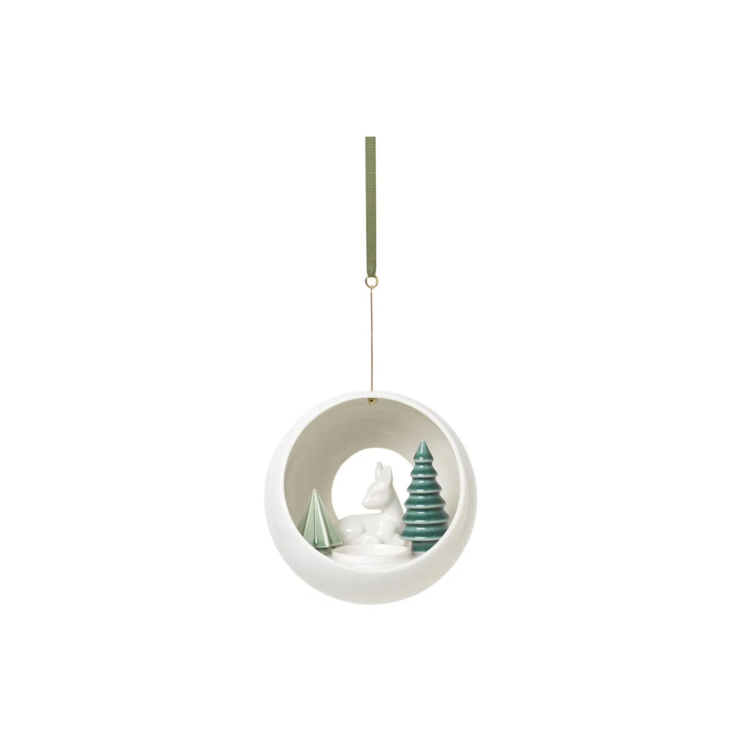 Kugle med et lille hjortekid og træer – beregnet til fyrfadslys. Der medfølger et grønt bånd, så kuglen kan hænge i vinduet. Winter Stories er små magiske fortællinger om nordens særlige lys og landskab. De bringer varme og hygge til de mørke vinterdage.