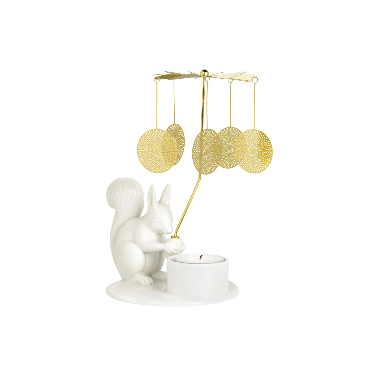 Fyrfadsstage med et egern og englespil i messing, der drejer rundt når lyset tændes. Winter Stories er små magiske fortællinger om nordens særlige lys og landskab. De bringer varme og hygge til de mørke vinterdage. Dekorativ fyrfadsstage uden lyd.