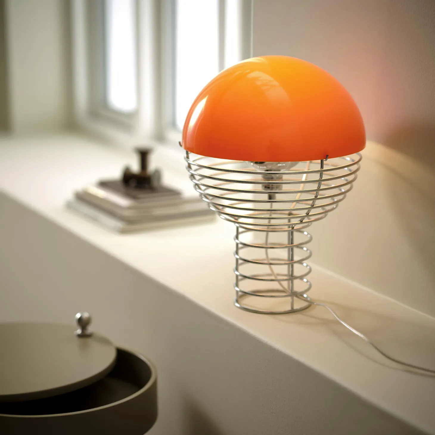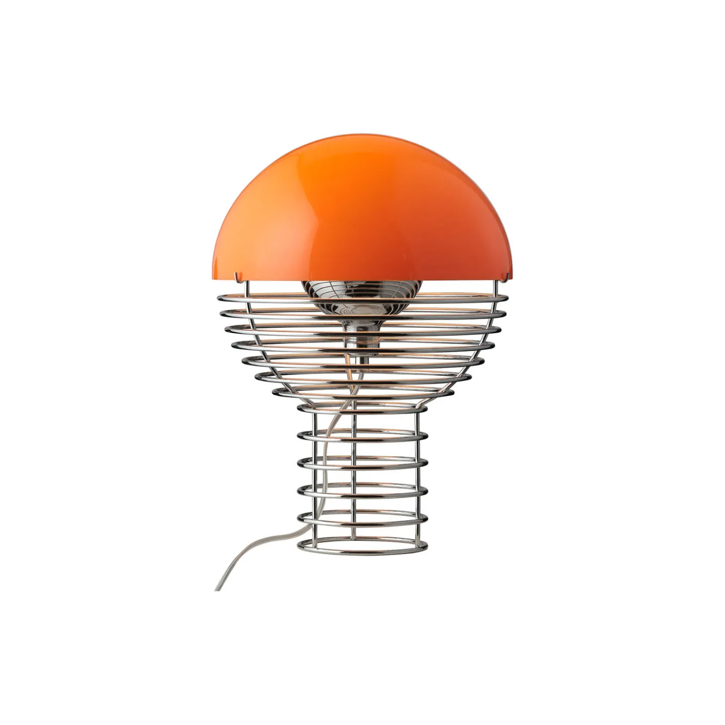 Wire bordlampe i forkromet stål og plast fra Verpan. Farve: orange. Mål: H: 42 x Ø 30 cm. Lyskilde: maks. 60W E14. Design: Verner Panton.