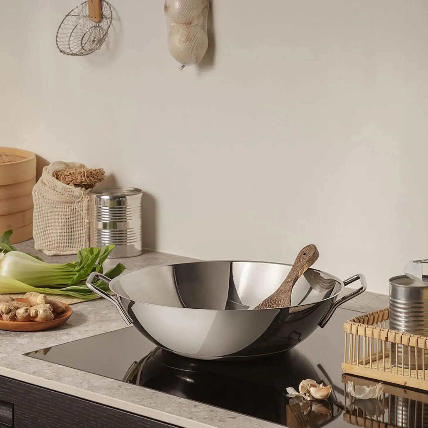 Wok med stor overflade og høje sider. Wokkens indhold er stort og kan med fordel anvendes til køkkenprocesser, der først kræver lynstegning og derefter tilsætning af saucer eller fond. Udført i rustfrit stål, som giver stor slidstyrke både udvendig og indvendig. Wokken er skabt til høj varme og lynstegning – også med mindre brug af fedtstof. Varmen fordeles hurtigt og jævnt på grund af den tykke og stabile bund. Grebene forbliver kolde under brug. Den tåler alle slags køkkenredskaber, meget høj varme og alle varmekilder inkl. induktion. Tåler maskinopvask.