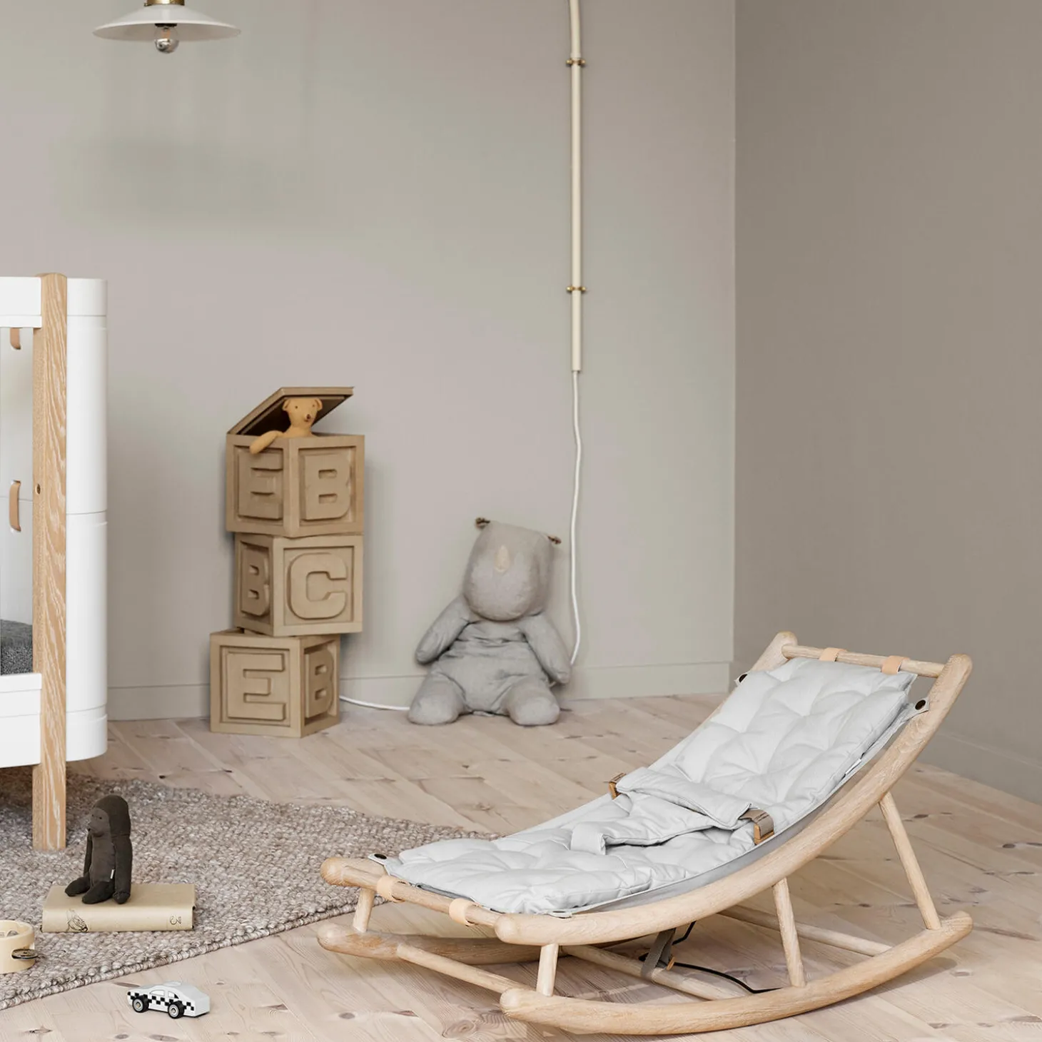 Wood baby & junior vippestol er i sit smukke design og delikate forarbejdning, et stilfuldt bud på den traditionelle skråstol. Vippestolen er praktisk, når baby er lille og gøremålene mange: Vippestolen tilfredsstiller såvel babys behov for bevægelse, der imiterer mors vuggen, som mors ønske om få minutters frihed til gøremål, der er svære at udføre med en baby på armen. Den lette vuggen, igangsat af barnets bevægelse og egen rytme, har en beroligende og stimulerende effekt, der gør stolen oplagt som base for underholdning og afslapning. Samtidig kan vippefunktionen slås fra, og skråstolen låses i sin vinkel, som er optimalt under madning og stille stunder. Som med øvrige skråstole, er Wood baby & junior vippestol designet til afbrudte siddestunder, hvor både barn og forælder får mulighed for kortvarigt at slå tonen an – i helt egen takt.Wood baby & junior vippestol kombinerer et gennemtænkt design og funktionalitet med det formål at give en lang levetid. Når den søde babytid er forbi, kan den bløde babyhynde, der danner den øverste del af sædet, fjernes, og baby vippestolen bliver til en smuk junior vippestol, der vil skabe glæde i mange år fremover. Småbørn op til 7 år / 25 kg kan læse, slappe af og nyde hyggelige øjeblikke i vippestolen. Den lave vægt og det stabile design gør det nemt for børn at flytte vippestolen med derhen, hvor behovet for den er. For Oliver Furniture er en lang levetid synonymt med bedre bæredygtighed.Baby & junior vippestolen er kendetegnet ved sit klassiske nordiske formsprog. De rundede detaljer skaber en visuel lethed og et ubesværet udtryk i indretningen, ligesom stolens enkle, bløde formsprog virker appellerende og tryghedsskabende for et lille barn.Wood baby vippestol kan anvendes fra nyfødt og indtil barnet er i stand til at sidde op selv eller vejer mere end 9 kg, alt efter hvad der sker først. Wood baby vippestol er designet i overensstemmelse med de relevante sikkerhedsstandarder og er testet i henhold til EN 12790. Benyt altid sikkerhedsselen og sikre at spænderne er lukkede, når stolen anvendes som baby vippestol.Wood junior vippestol kan anvendes, når dit barn har lært at gå og sidde oprejst uden hjælp. Den bløde babyhynde, der danner den øverste del af sædet, kan nemt fjernes, hvorefter baby vippestolen forvandles til en smuk junior vippestol til børn op til 7 år/25 kg.Wood baby & junior vippestol er udført med et understel i massiv hvid-olieret eg, en babyhynde og et juniorsæde fremstillet af Øko-Tex-bomuld med et fyld af Øko-Tex genanvendt PET. Babyhynden fastgøres til juniorsædet med velcro, og juniorsædet fastgøres til vippestolen ved hjælp af trykknapper og vippestolens læderremme.Babyhynden og juniorsædet kan maskinvaskes ved 40°.Babyen er sikret med selen, der er forbundet med hynden, sædet og vippestolen.Wood baby & junior vippestol er produceret i Europa og overholder de strenge EU-krav for sikkerhed og sundhed. Vippestolen til baby er testet og godkendt i henhold til EN 12790: 2009. Der er anvendt ikke-giftig olie til hvid-olieringen.
