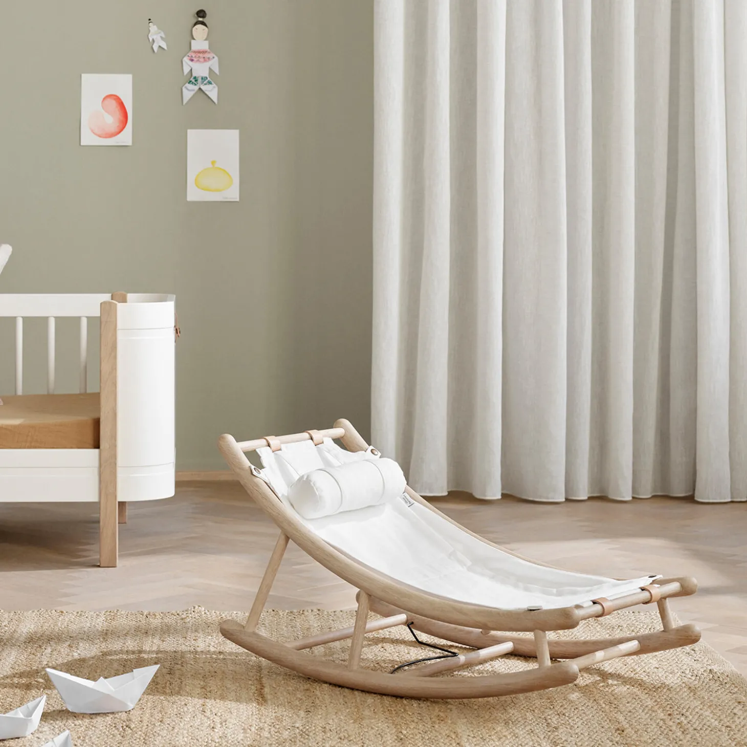 Wood junior vippestol er i sit smukke design og delikate forarbejdning, et stilfuldt bud på en stol til børneværelset. Småbørn op til 7 år / 25 kg år kan læse, slappe af og nyde hyggelige øjeblikke i vippestolen. Den lave vægt og det stabile design gør det nemt for børn at flytte vippestolen med derhen, hvor behovet for den er.Juniorsædet kan maskinvaskes ved 40°.Wood junior vippestol er udført med understel i massiv hvid-olieret eg og juniorsæde i Oeko-Tex bomuld med en nakkepude med Oeko-Tex fyld af genanvendt PET. Juniorsædet fastgøres til vippestolen ved hjælp af trykknapper og vippestolens læderremme. Juniorsædet kan maskinvaskes ved 40°.Vippestolen er som de øvrige møbler i Oliver Furnitures Wood Collection, kendetegnet ved sit klassiske nordiske formsprog. De rundede detaljer skaber en visuel lethed og et ubesværet udtryk i indretningen, ligesom stolens enkle, bløde formsprog virker appellerende og tryghedsskabende for det mindre barn.Wood junior vippestol er produceret i Europa og overholder de strenge EU-krav for sikkerhed og sundhed. Der er anvendt ikke-giftig olie til hvid-olieringen.