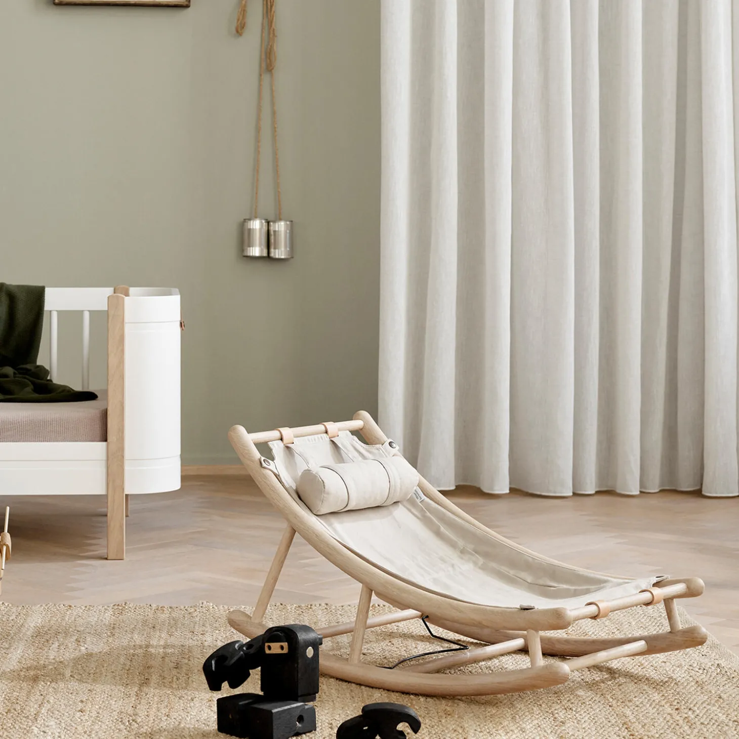 Wood junior vippestol er i sit smukke design og delikate forarbejdning, et stilfuldt bud på en stol til børneværelset. Småbørn op til 7 år / 25 kg år kan læse, slappe af og nyde hyggelige øjeblikke i vippestolen. Den lave vægt og det stabile design gør det nemt for børn at flytte vippestolen med derhen, hvor behovet for den er.Juniorsædet kan maskinvaskes ved 40°.Wood junior vippestol er udført med understel i massiv hvid-olieret eg og juniorsæde i Oeko-Tex bomuld med en nakkepude med Oeko-Tex fyld af genanvendt PET. Juniorsædet fastgøres til vippestolen ved hjælp af trykknapper og vippestolens læderremme. Juniorsædet kan maskinvaskes ved 40°.Vippestolen er som de øvrige møbler i Oliver Furnitures Wood Collection, kendetegnet ved sit klassiske nordiske formsprog. De rundede detaljer skaber en visuel lethed og et ubesværet udtryk i indretningen, ligesom stolens enkle, bløde formsprog virker appellerende og tryghedsskabende for det mindre barn.Wood junior vippestol er produceret i Europa og overholder de strenge EU-krav for sikkerhed og sundhed. Der er anvendt ikke-giftig olie til hvid-olieringen.