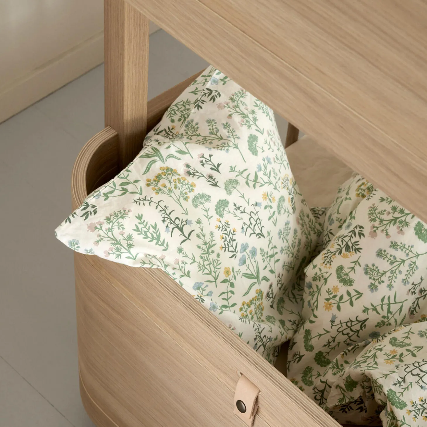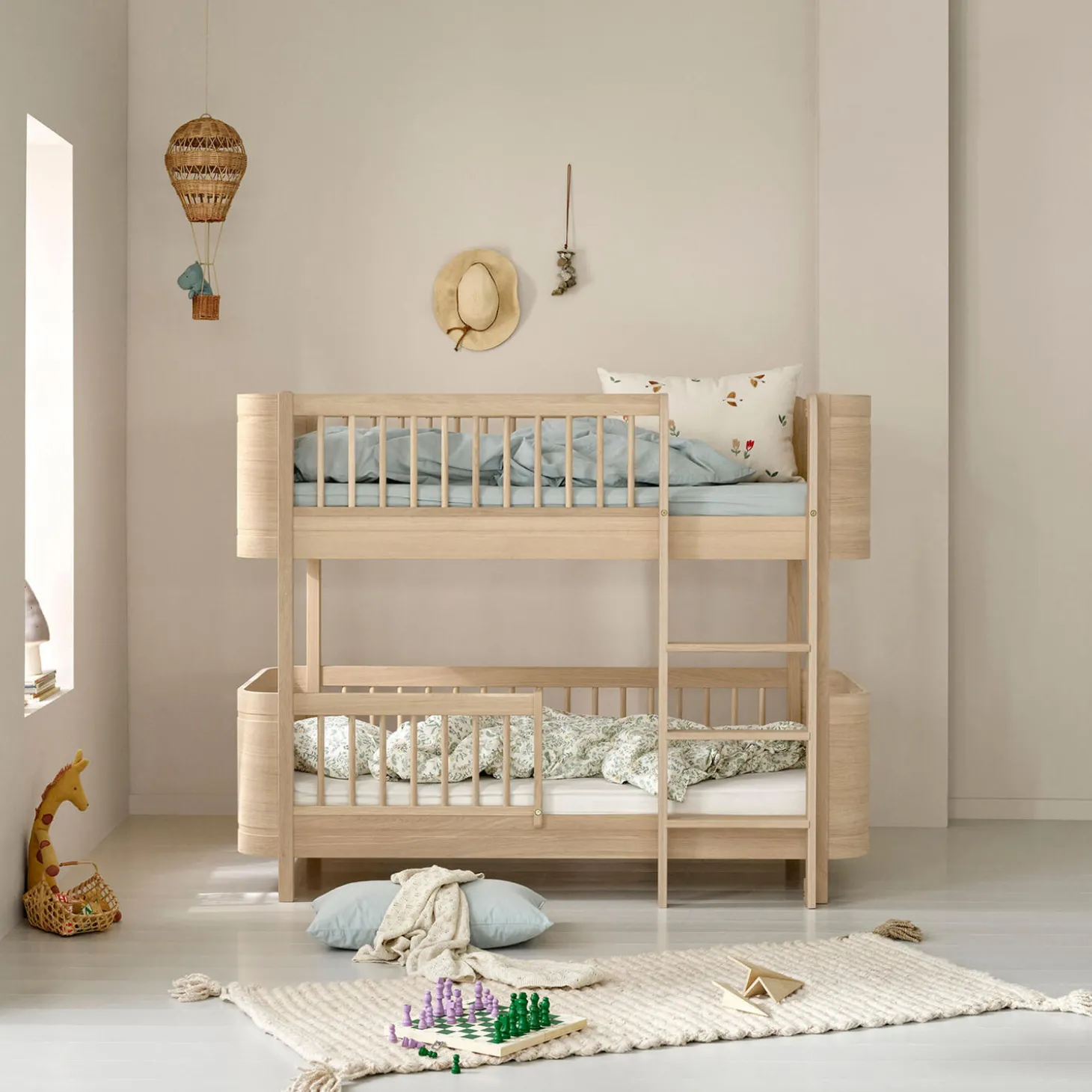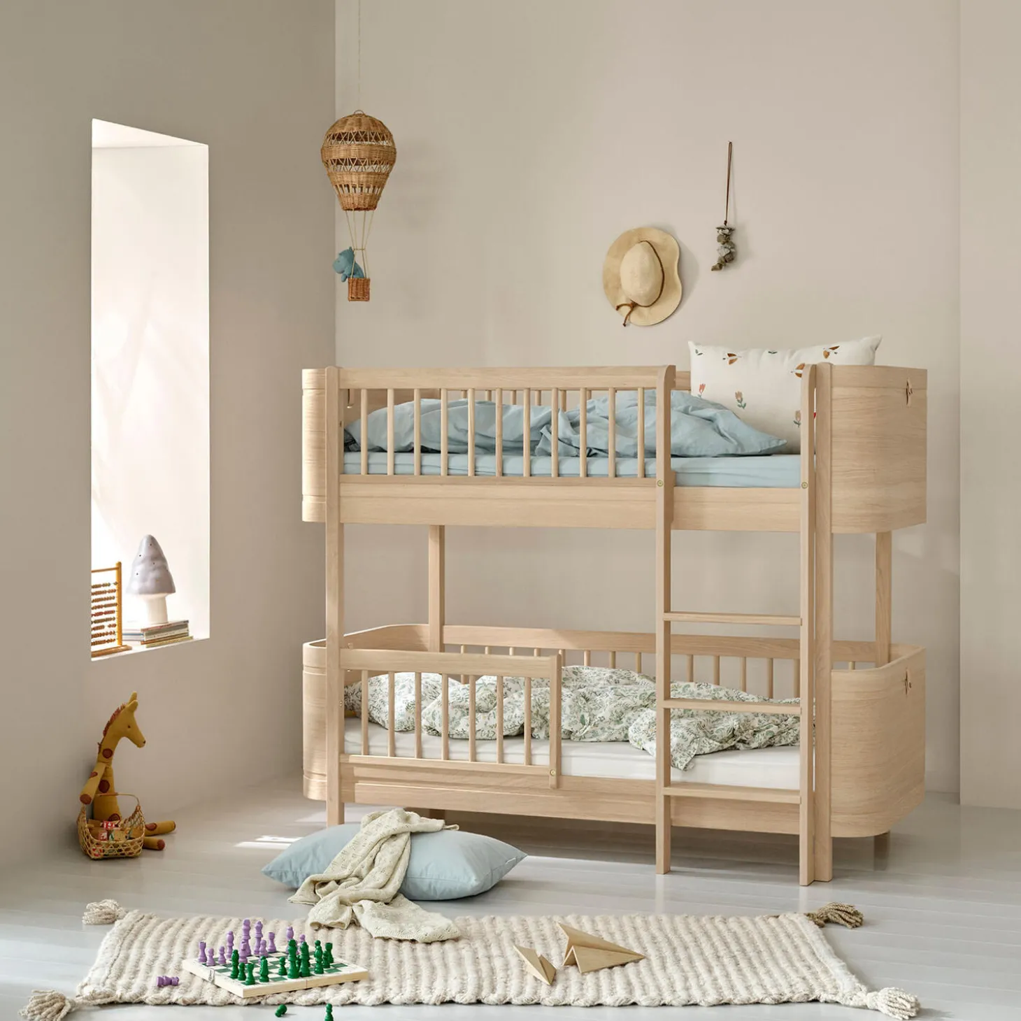 I anledning af vores 20-års jubilæum udvider vi vores populære Wood Mini+ sengeserie med en eksklusiv version i eg. Seriens funktionelle og fleksible designkoncept, kombineret med egetræets kompromisløse kvalitet og unikke udtryk, sikrer en lang levetid.Mini+ halvhøj køjeseng er designet til at imødekomme behovet for to sovepladser i et mindre børneværelse. Mini+ halvhøj køjeseng er mindre i både bredde og længde end den klassiske køjeseng fra Wood Collection og er derved oplagt i mindre rum. Mini+ halvhøj køjeseng passer til søskendeparret, der er vokset ud af tremmesengens trygge favntag, men som sover bedst med natlampen tændt og en søster eller bror indenfor rækkevidde. Sengen udgør en stilfuld base på børneværelset, og tilbyder, i sit gennemtænkte design, plads til både store personligheder og små sovehjerter.Stigen kan kun placeres i højre side af sengen.Wood Mini+ eg er fremstillet af hvidolieret massiv eg og formspændt birk fineret i eg.Naturligt træ kan have forskellige toner og udseende. Små toneforskelle på tværs af delene kan forekomme. Vær opmærksom på, at træoverflader kan falme i direkte sollys. De ikke-synlige skruer giver sengen et rent og eksklusivt design og er særligt kendetegnende for Oliver Furniture. Stilen er skandinavisk med rene linjer, runde former og enkle detaljer, som læderrem i gavlen.Serien er produceret i Europa og overholder de strenge EU-krav for sikkerhed og sundhed. Produkterne er behandlet med hvidpigmenteret olie baseret på hørfrø-, solsikke- og jojobaolie.Bæreevne (statisk vægt):Mini+ tremmeseng: 30 kgMini+ juniorseng, halvhøj seng og halvhøj køjeseng: 120 kg SIKKERHED OG KRAVI henhold til EN 747 er højsenge og den øverste seng i køjesenge ikke egnet til børn under 6 år på grund af risikoen for fald.Et mindre barn kan sove i den nederste køjeseng, eventuelt med en sengehest for ekstra sikkerhed.