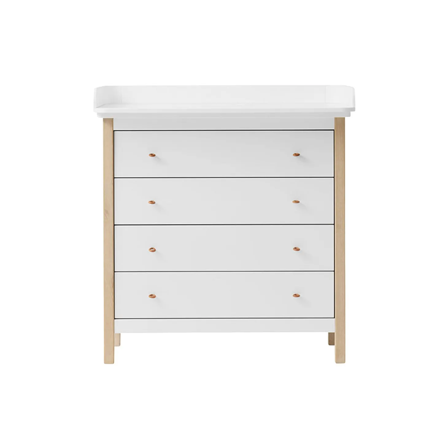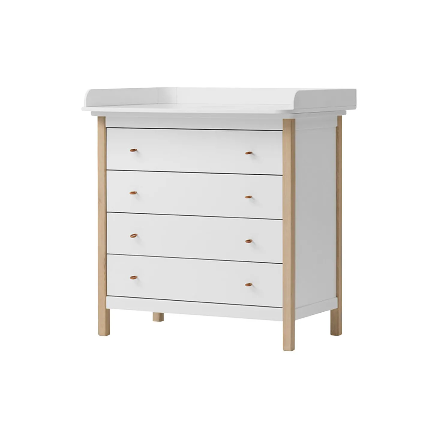 Wood puslekommode har et klassisk hvidt design kombineret med flere fine detaljer. Gennemgående ben af hvidolieret nordisk eg samt læderstropper i skuffefronterne tilfører designet naturlig kant.Kommoden har fire skuffer der alle åbnes med læderstropper af 100% kernelæder. Skufferne er solide og kører på skinner af høj kvalitet med ’soft lock’ funktion.Puslekommoden har en lang levetid, når pusletoppen ikke længere er nødvendig fjernes den nemt og tilbage står en kommode som kan bruges på børneværelset eller i et af hjemmets andre rum.Wood kommode med 4 skuffer er fremstillet i MDF, der er konstrueret træ, der består af 60% birk, 20% fyrretræ og 20% asp træ. MDF er meget stærkt og holdbart. Benene er i massivt egetræ.De ikke-synlige skruer giver kommoden et rent og eksklusivt design og er særligt kendetegnende for Oliver Furniture. Stilen er skandinavisk med rene linjer og enkle detaljer som greb af kernelæder og gennemgående ben i smuk, hvid-olieret eg.Kommoden er produceret i Europa og overholder de strenge EU-krav for sikkerhed og sundhed. Kommoden er malet med ikke-giftig, vandbaseret maling.
