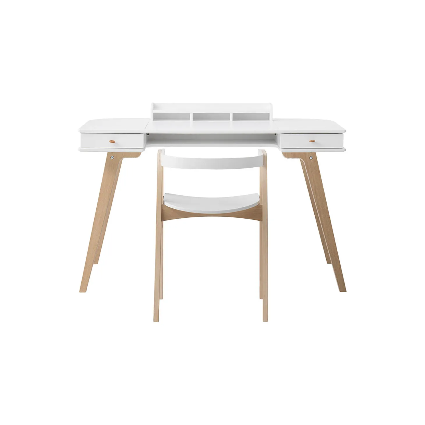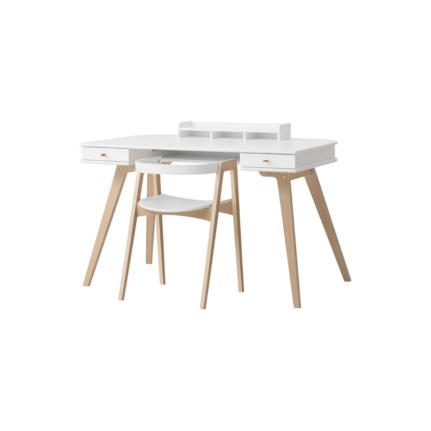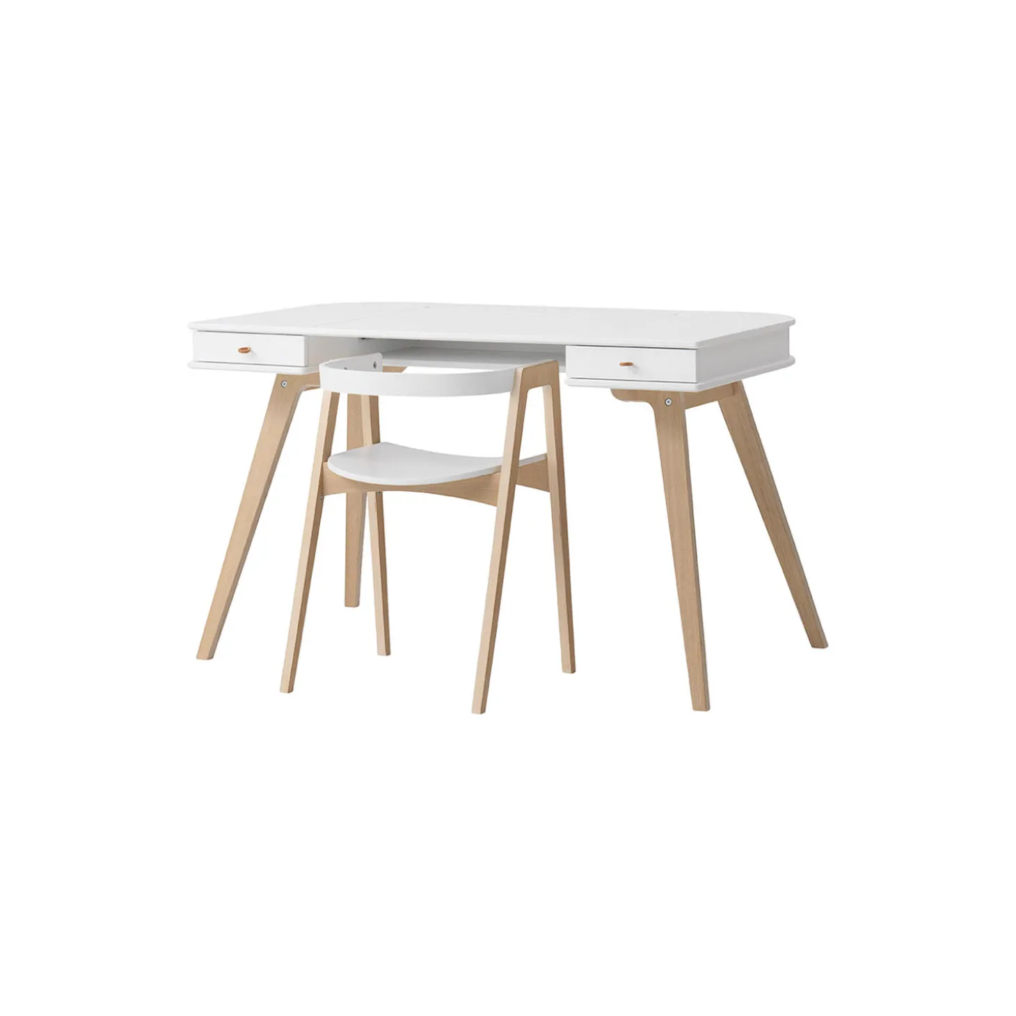 Wood skrivebord er med sine delikate mål og talrige funktioner oplagt til børne- og teenageværelset, men fungerer også smukt i et hjørne af stuen eller i køkkenets krog. Bordet har mulighed for to højder, idet man kan udskifte benene, og er desuden udstyret med to skuffer, der i mål er som skabt til A4-blokke og andre skole- og tegneartikler, og en skjult hylde med plads til ledning og oplader, hvor laptop og øvrig elektronik kan have fast plads. Bordets indbyggede tegneplade, der kan vippes op fra bordet og i øvrigt trinjusteres som et slags mini-staffeli, gør bordet oplagt som station for både tegning og læsning, mens den vendbare brevordner med tre rum og en hylde, sørger for orden og overblik. Bordet appellerer i sit gennemtænkte design til små, kreative hoveder, der her kan både udtænke og nedfælde store arkitektoniske ideer på såvel skærm som papir.Wood armstol er designet som oplagt supplement til Wood skrivebord. Wood armstol kan justeres i to højder og passer til begge Wood skriveborde. Stolens rundede rygstykke og delikate samlinger, skaber en visuel lethed og et ubesværet udtryk i indretningen, mens detaljer som stellets let skrånende ben, er udtryk for den høje håndværksmæssige kvalitet. Den stabile stol er i sit på en gang enkle og lidt nostalgiske design skabt til at være afsæt for såvel gode samtaler og koncentreret alenetid for både store og små.Wood skrivebord er fremstillet i hvidolieret egefiner, birk og MDF, der er konstrueret træ, der består af 60% birk, 20% fyrretræ og 20% asp træ. MDF er meget stærkt og holdbart. Wood armstol er udført i formspændt birk og hvidolieret egefiner.De ikke-synlige skruer giver et rent og eksklusivt design og er særligt kendetegnende for Oliver Furniture. Stilen er skandinavisk med rene linjer, runde former og raffinerede detaljer, der skaber en visuel lethed og et ubesværet udtryk i indretningen.Wood skrivebord & armstol er produceret i Europa og overholder de strenge EU-krav for sikkerhed og sundhed. Bordet og stolen er malet med ikke-giftig, vandbaseret maling.