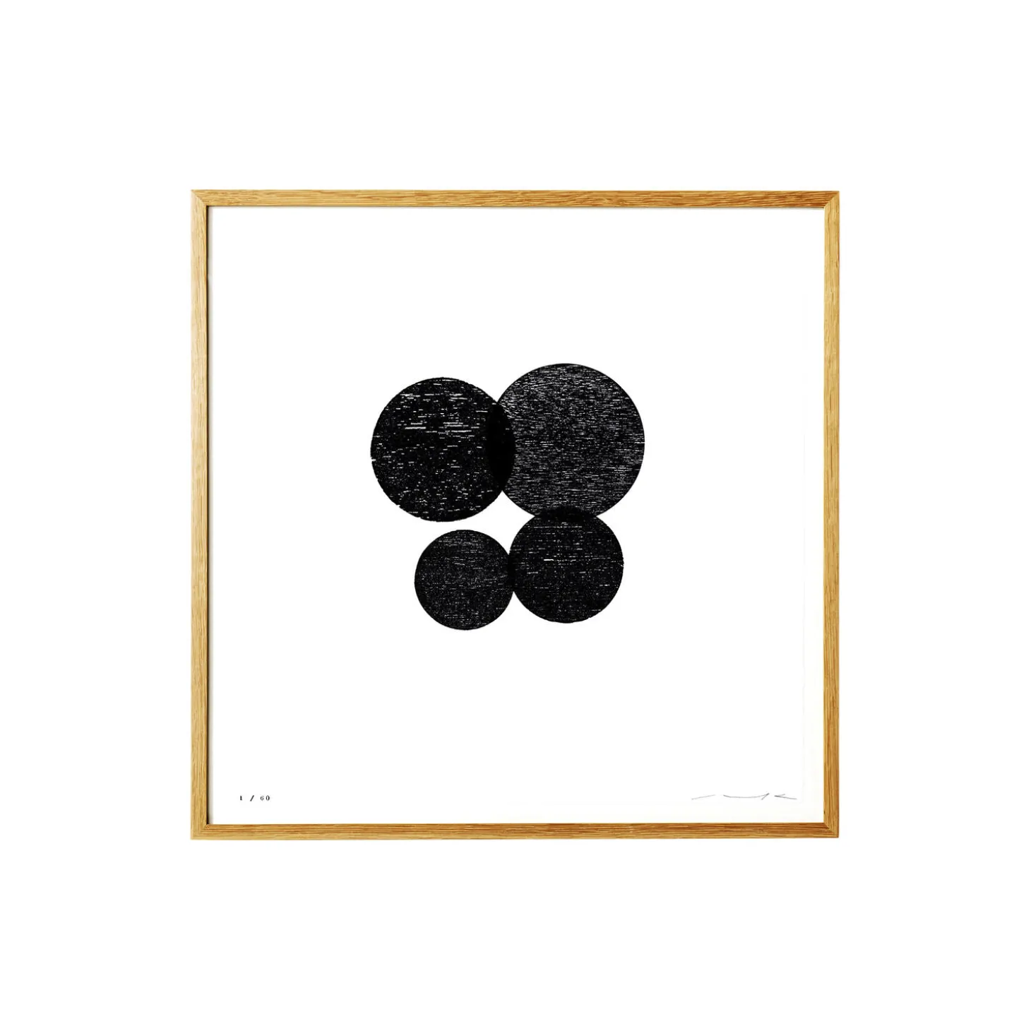 WOOD WORKS 4 black print i blæk trykt på bambuspapir og ramme i eg fra MOTARASU. Farve: hvid/sort. Mål: 45×45 cm. Design: Masayuki Koitabashi.