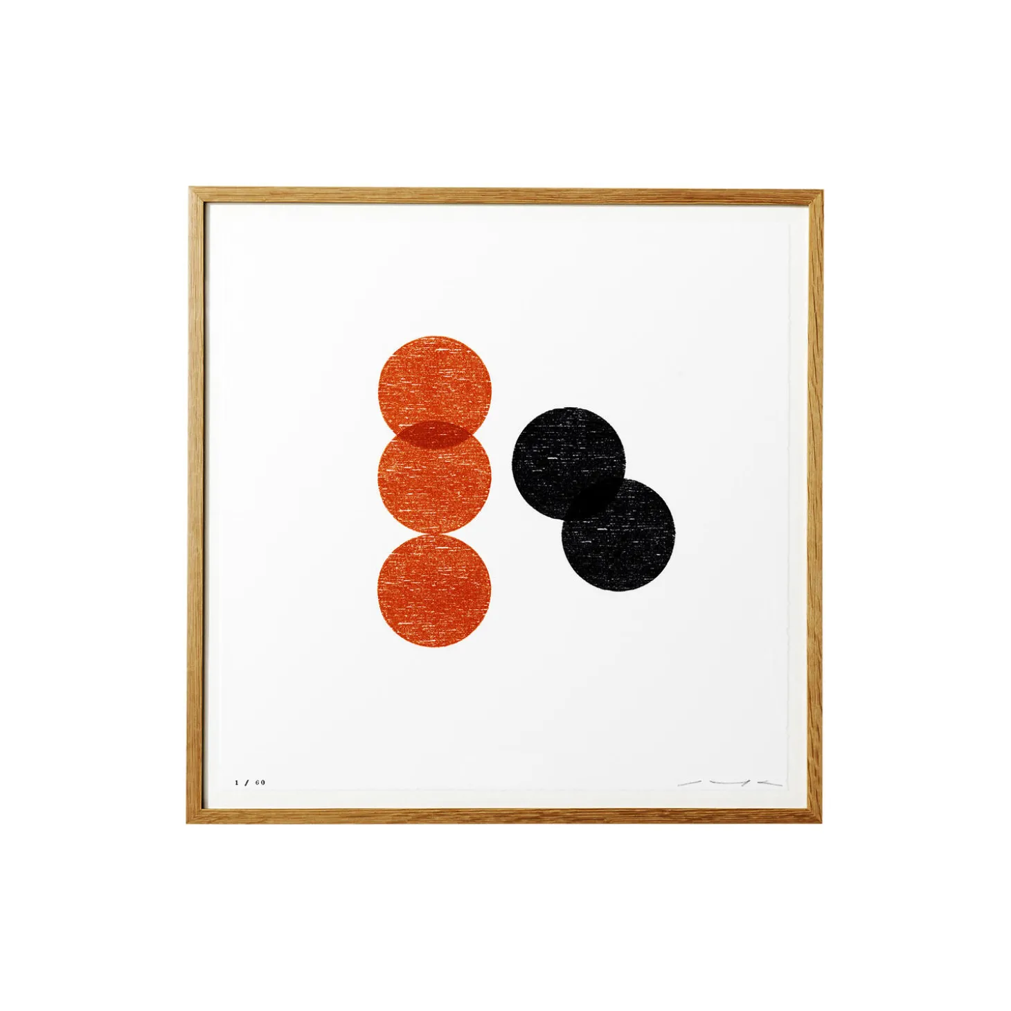 WOOD WORKS 4 black & red print i blæk trykt på bambuspapir og ramme i eg fra MOTARASU. Farve: hvid/rød. Mål: 45×45 cm. Design: Masayuki Koitabashi.
