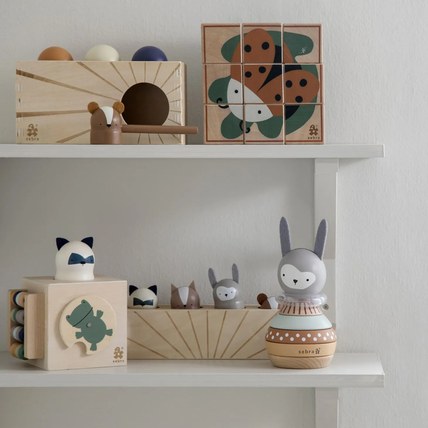 Sjov og underholdende aktivitetsfirkant med babyspejl, kugleramme, drejeskiver samt et bevægelie vaskebjørn på toppen, som siger en lyd, når den trykkes ned. Aktivitetslegetøjet hører til Sebras Woodland kollektion.