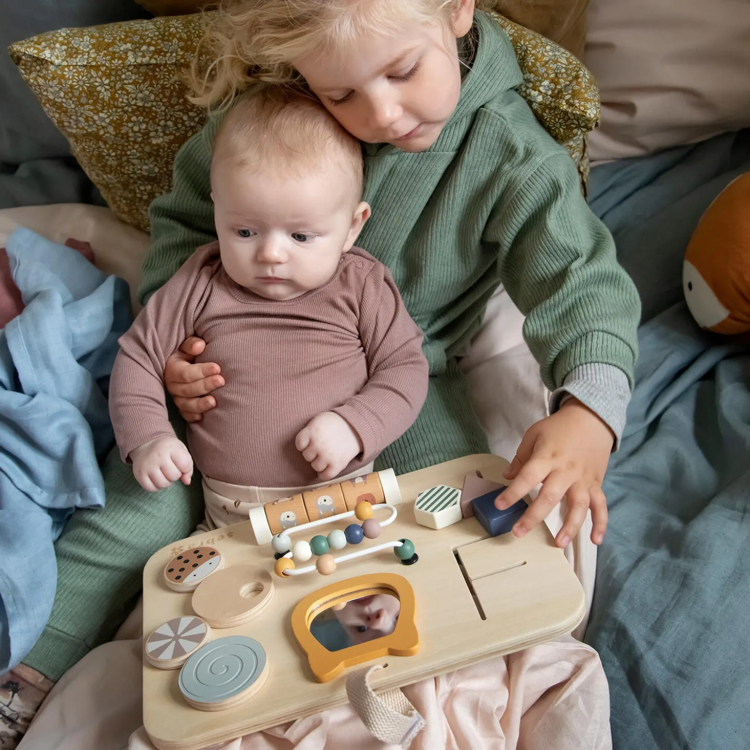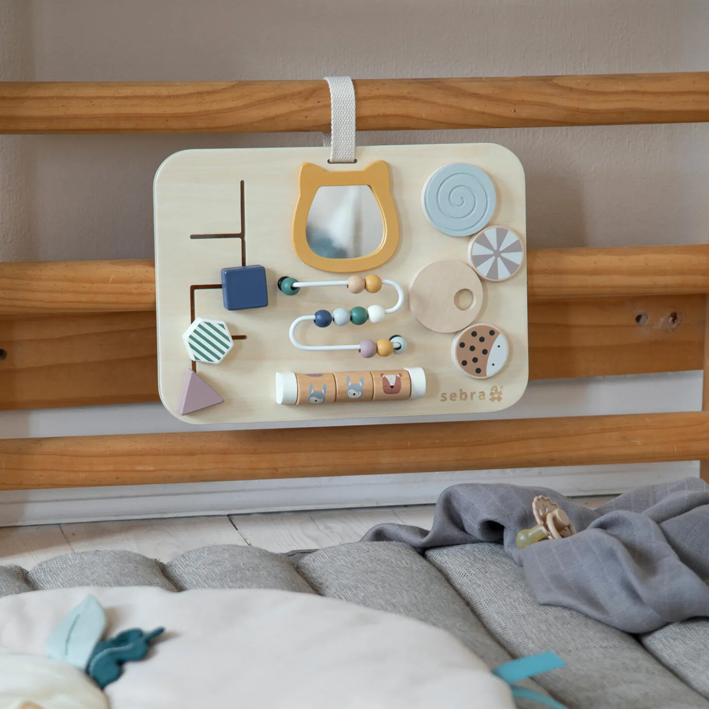 Aktivitetstavle i træ med sjove, bevægelige dele og flotte farver fra Woodland-serien. Perfekt til at træne finmotorikken, når baby skubber, drejer og ruller delene rundt på tavlen.