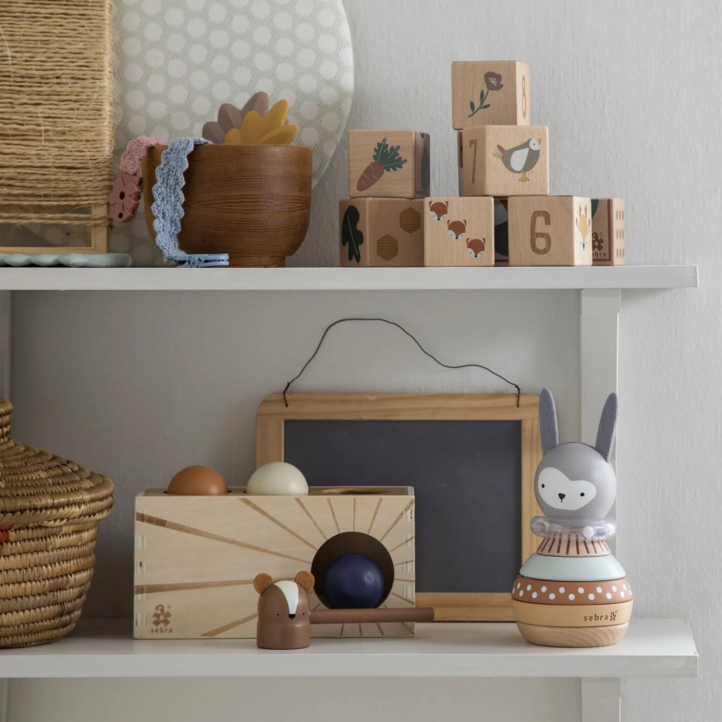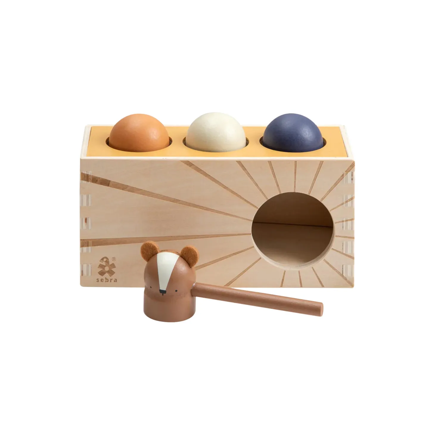 Sjovt hammerbræt i træ med tre farvede kugler samt en hammer til leg for de yngste børn. Hammerbrættet hører til Sebra Woodland kollektion.