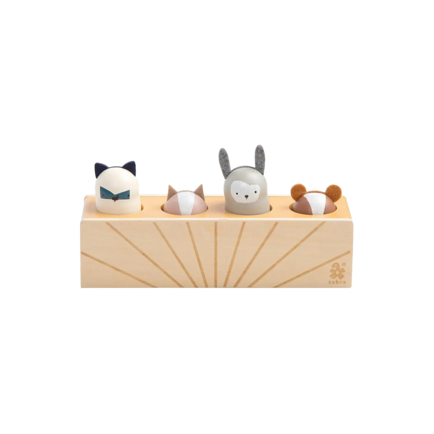 Sjovt pop-up aktivitetslegetøj med fire dyr, som på skift hopper op og ned når barnet trykker på dem. Trælegetøjet hører til Sebras Woodland kollektion.