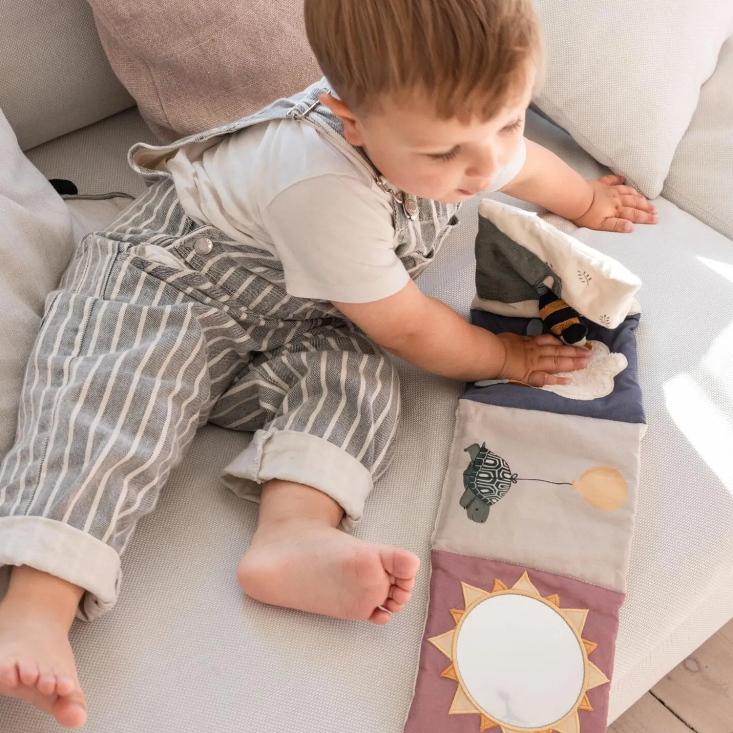 Blød stofbog af certificeret, økologisk bomuld til baby. Dekoreret med World of Sebra-temaet.