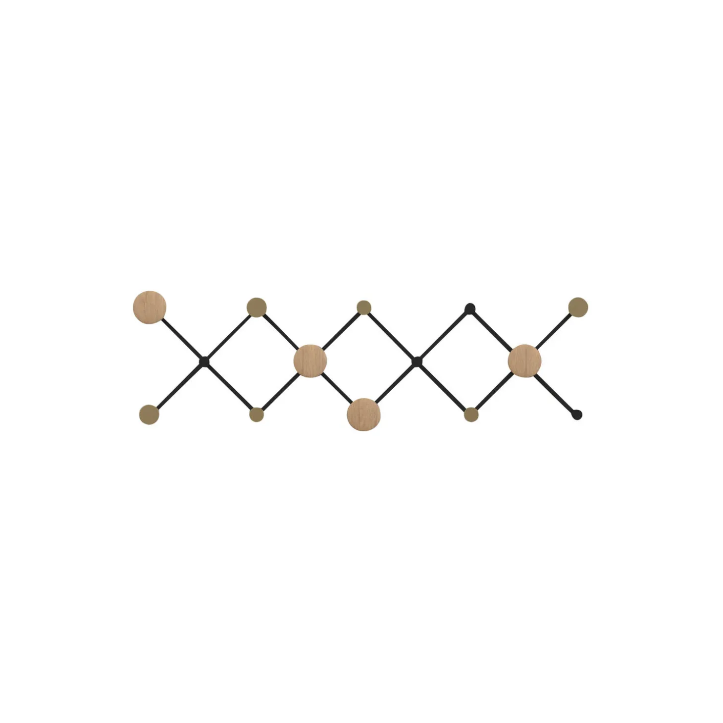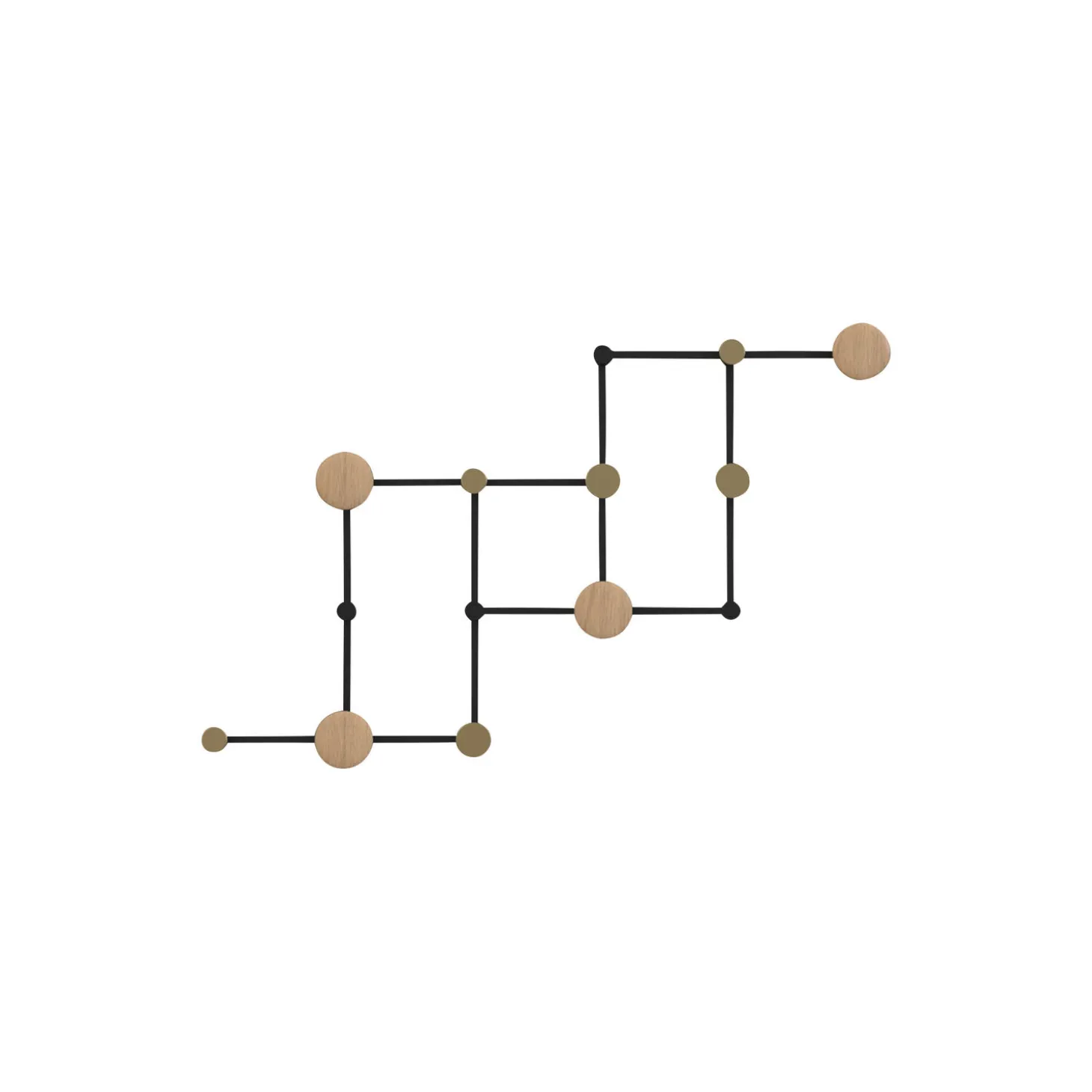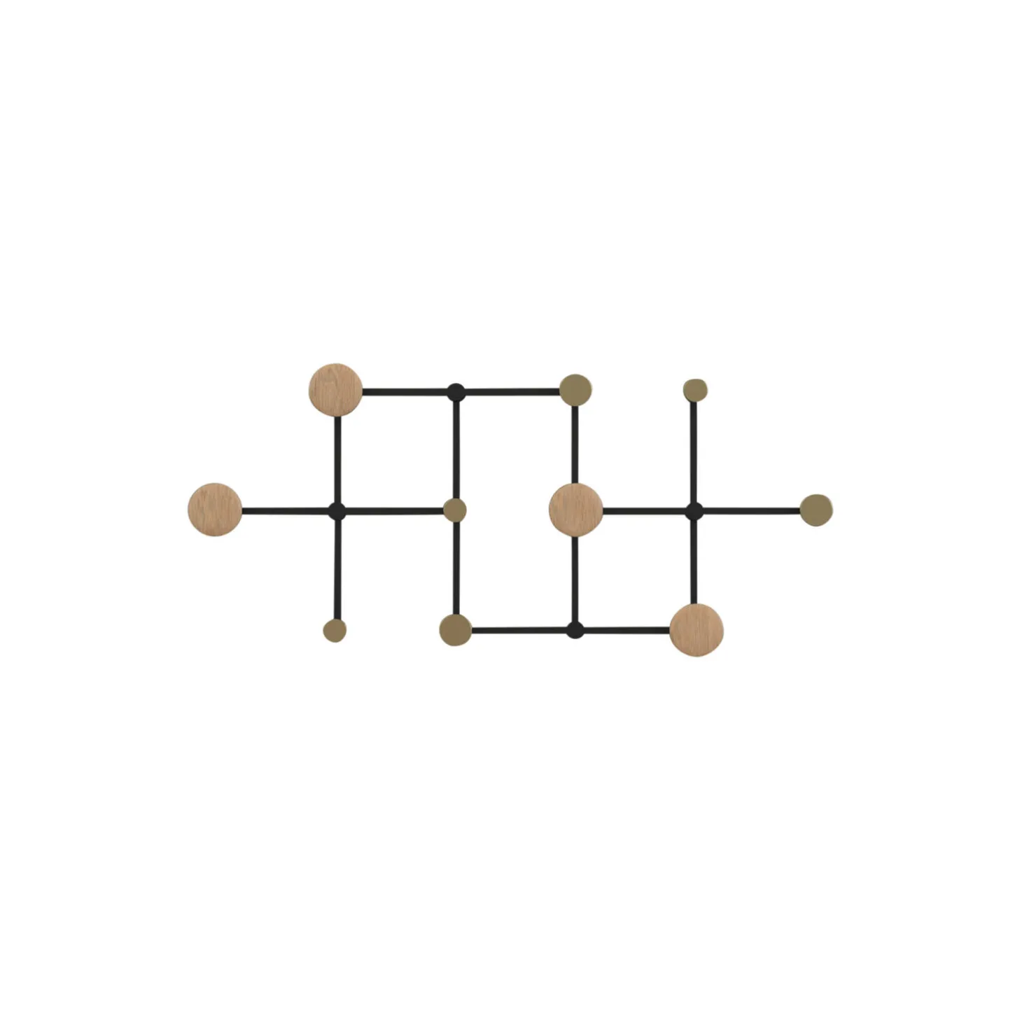X•TEND knagerække i genbrugsplast, eg og messing fra X•TEND. Farve: sort/eg. Sæt med 8 arme i 30,5 cm, 4 træknopper i 6,3 cm og 6 messingknopper i 2 størrelser 2,8 cm og 3,8 cm.