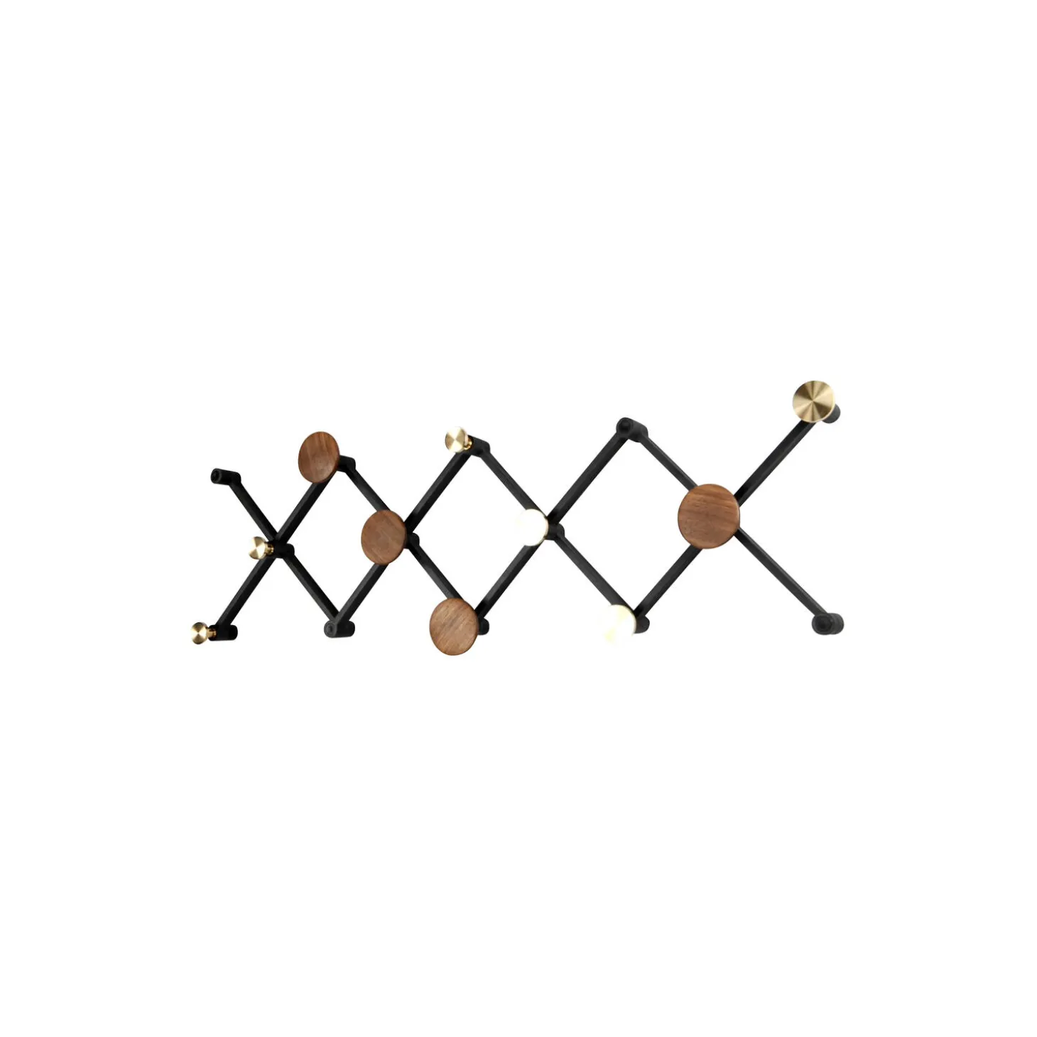 X•TEND knagerække i genbrugsplast, valnød, messing fra X•TEND. Farve: sort/valnød. Sæt med 8 arme i 30,5 cm, 4 træknopper i 6,3 cm og 6 messingknopper i 2 størrelser 2,8 cm og 3,8 cm.
