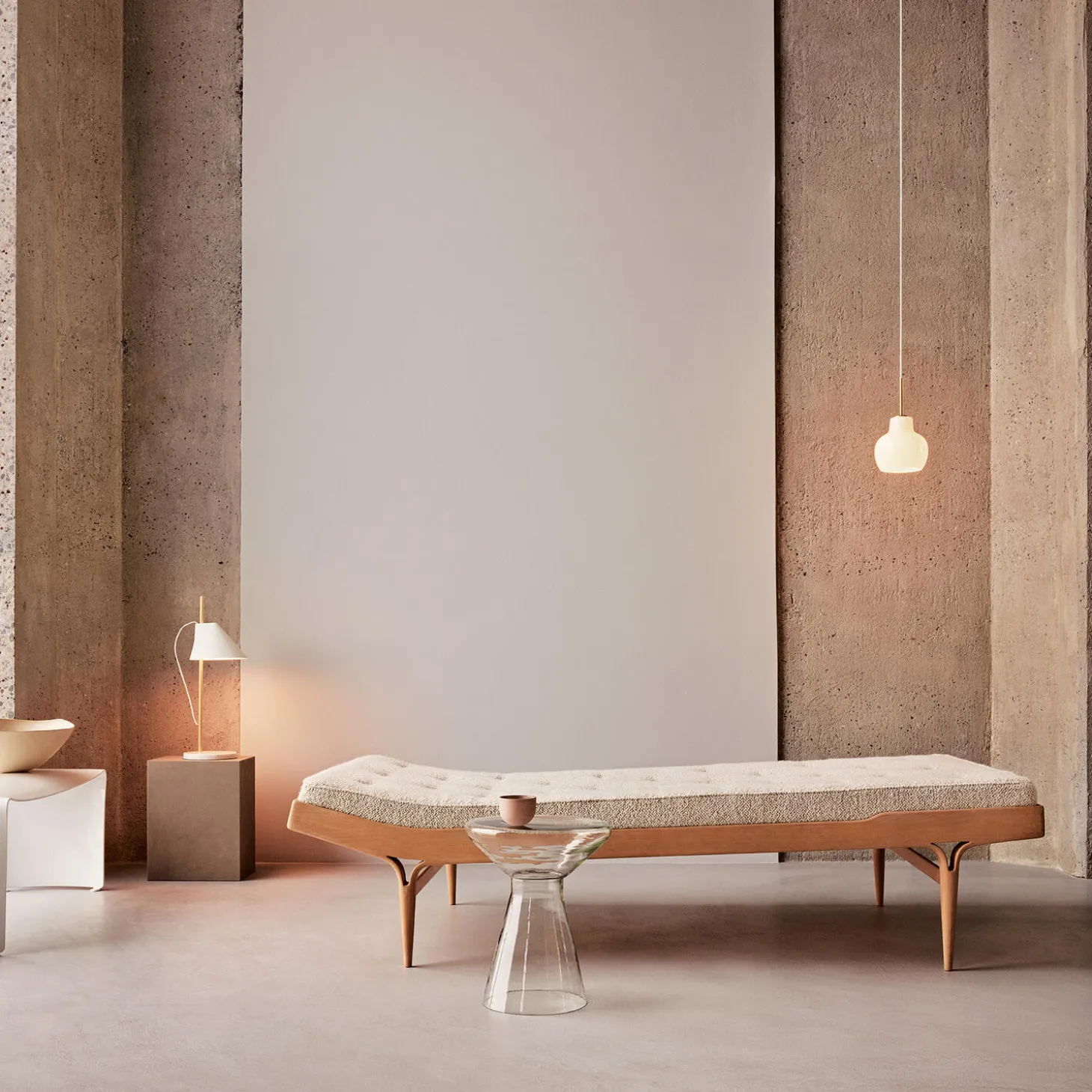 Yuh bordlampe i vådlakeret aluminium med stander i ekstruderet messing fra Louis Poulsen. Farve: hvid. Mål: H: 61 x Ø 20 cm. Lyskilde: LED 2700K 10W. Design: GamFratesi.