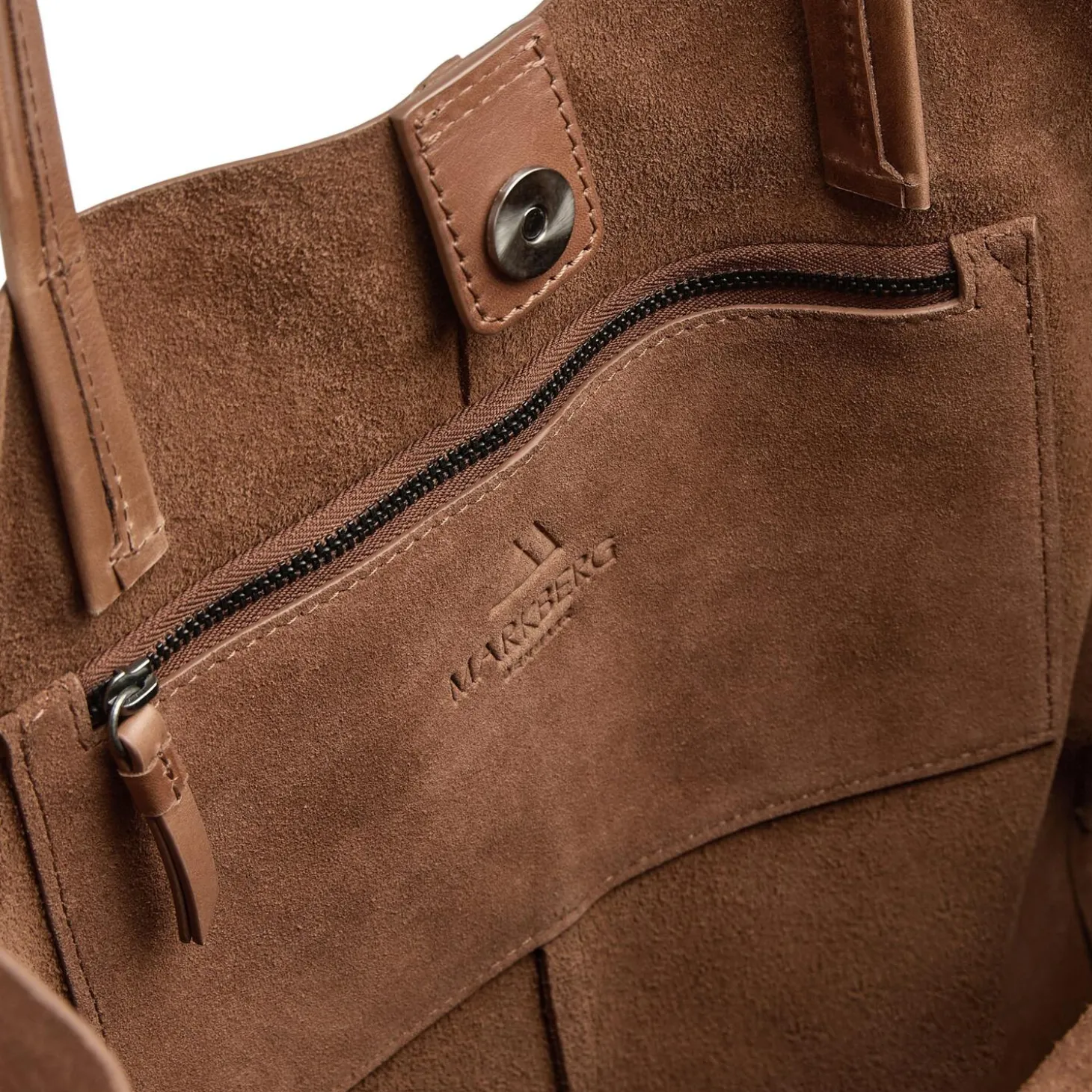 Zarah Shopper i Suede fra Markberg er produceret i 100% Cow suede leather. Den perfekte Shopper til arbejdet eller hverdagsbrug. Tasken indebære to gode hanke, så den kan bruges over armen eller skulderen. Tasken kan bruges til arbejdet og kan indebære op til en 17” tommer computer. Tasken har ét stort åbent hoved rum, som lukkes med magnetisk trykknap. Indeni rummet er der er lille lynlåslomme i siden. Tasken har ingen linning, og målene er 31 cm x 33 cm x 14 cm.